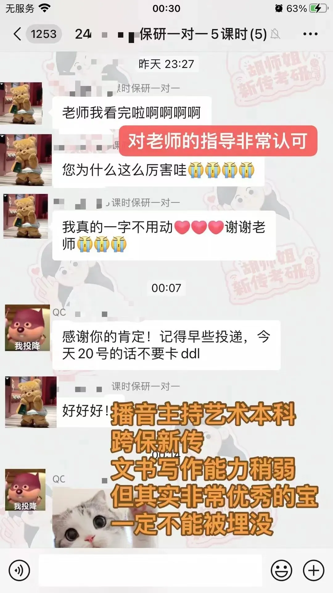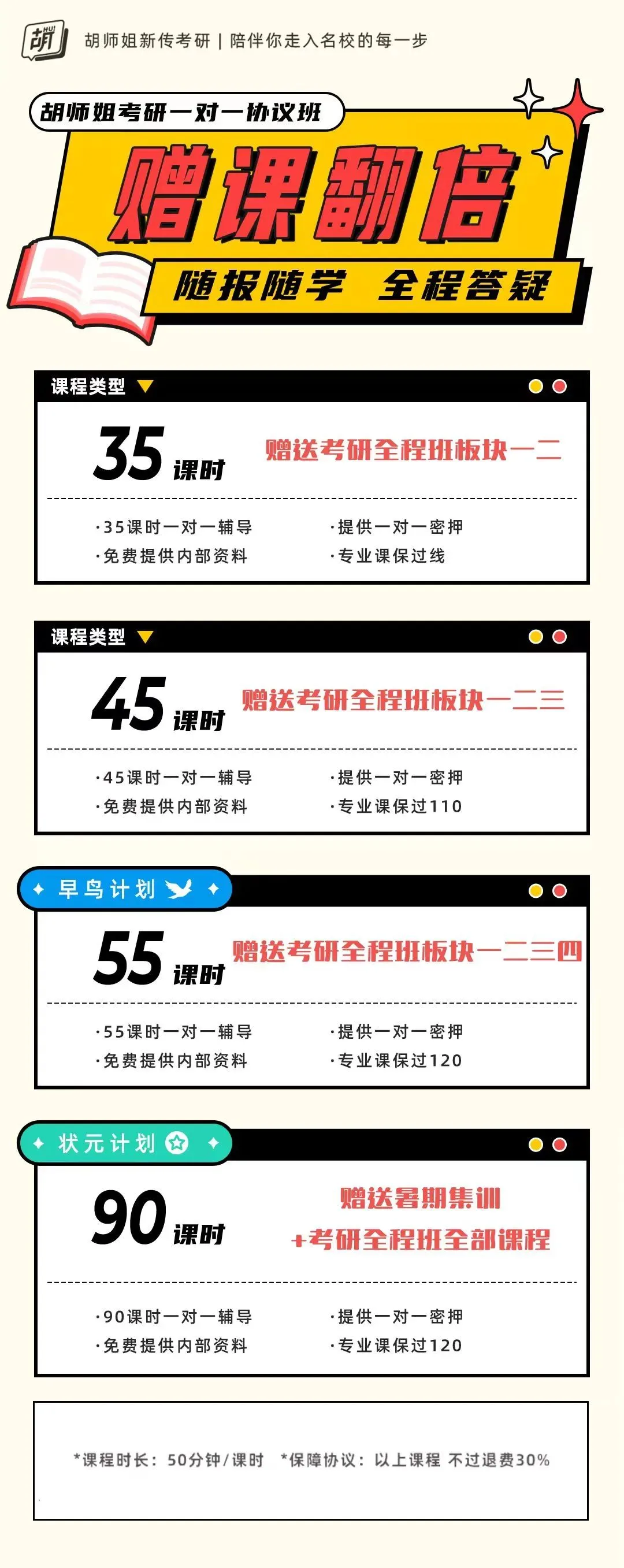 这种结合方式将帮助你更好地掌握新闻传播学科的知识和技能,提高你的学习效果和备考效率。当胡师姐新传考研一对一班与免费赠送的新传考研全程班相结合时,会产生一加一大于二的效果。你将获得针对性的指导和全面的学习支持,从而提高学习效果和备考效率。