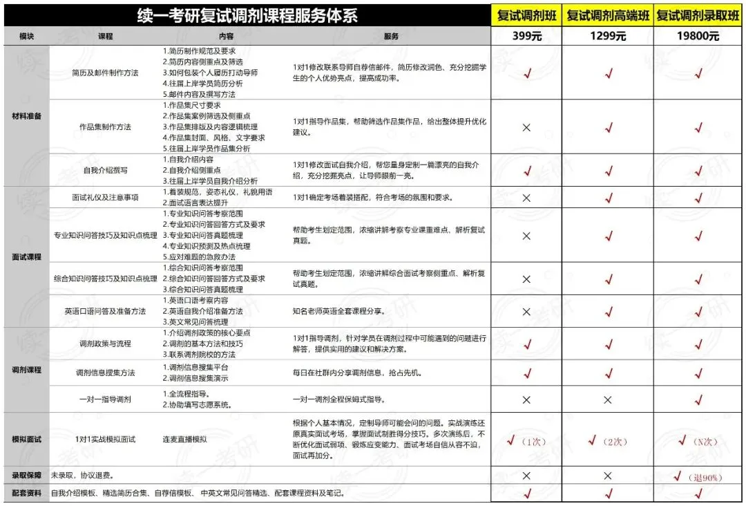1对1贴心辅导服务:1对1帮写导师自荐信邮件、1对1修改简历、1对1指导作品集、1对1督学复试课程、1对1答疑指导调剂,最终优选最可能录取的“高、中、低”3所调剂院校,提高调剂成功率;学生省心省力无后顾之忧。