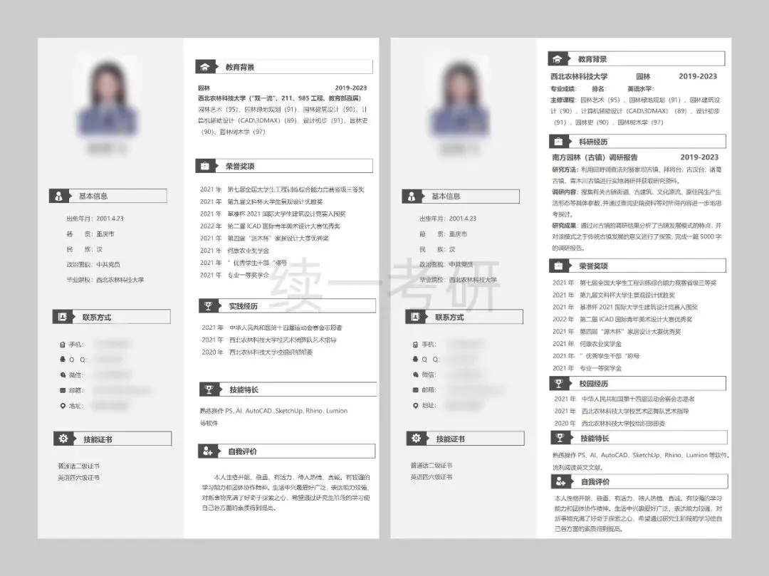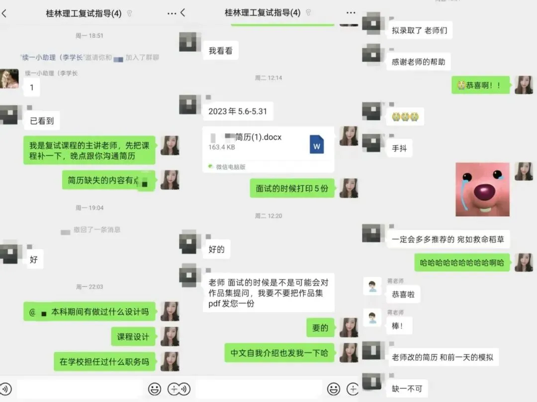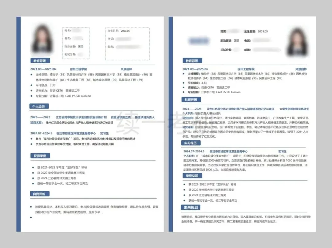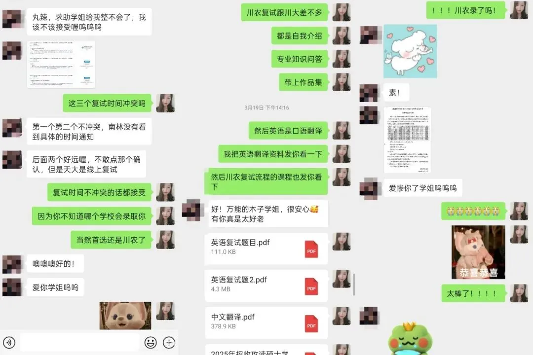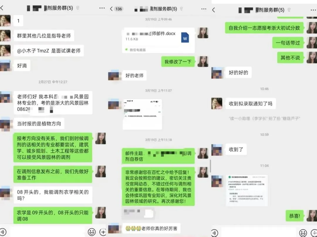木子学姐说:这是我接过的最极限的调剂复试同学。4月21日周一下午找到我,问能不能提供桂林理工大学的复试调剂指导,我介绍了服务后当即就决定报名了。周一下午发了复试面试课程回放,晚上建立了调剂复试指导群,完成了简历的修改制作,周二晚上第一次直播课,沟通了自我介绍,并且讲解了专业课、英语备考的快速方法,分享了模板。周三上午我将修改好的自我介绍返回,晚上第二次直播课,进行一对一模拟面试。周四下午收到了拟录取通知。虽然时间紧张,但是有惊无险,顺利上岸啦!木子学姐说:因为没能进入一志愿复试,也都决定要二战了,甚至26的基础课程都开始参加了。但是,我一直给大家建议都是能调剂就调剂,二战风险很大,所以也就同时准备复试调剂了,复试的自我介绍、简历、作品集都进行了一对一修改。最后成功调剂到桂林理工大学,不用二战了!!木子学姐说:西南民族大学2025年第一年招收风景园林硕士,一志愿没有录满,放出了调剂名额。2025年共16人进入调剂复试,7人是续一学员(其中2人放弃复试),4人录取。这4位同学一志愿均为四川大学,也都是我初试及复试班的学员。木子学姐说:这位同学一志愿报考四川大学风景园林,川大全程系统班的学员,初试368分。虽然与一志愿川大失之交臂,但本科期间学习成绩优异,有过多篇论文发表的经历,设计作品也曾多次获得大奖,在模拟面试的时候我就感叹,太优秀了!这样的条件进入调剂简直嘎嘎乱杀。进入调剂后,收到了中国农业大学和中国林业科学研究院的复试通知,两所学校也都顺利录取。这两所院校的专业实力在全国排名稳居前列,无论是科研资源、学术平台还是行业影响力,都是国内顶尖水平。木子学姐说:经过综合分析和沟通,在调剂系统开放后,我建议尝试西北农林科技大学和东北林业大学的非全,最终成功调剂到东北林业大学。木子学姐说:这位同学初试的时候跟着我学了理论和快题,备考期间真的非常认真,理论作业真的都可以用来当讲义的程度!但发挥失常,初试只有326分,出分以后就复试和调剂同时准备,虽然当时知道自己可能进不了一志愿复试,但是复试班的课每次都认真听,也按照要求完成了简历、邮件、自我介绍、作品集的制作,我也都进行了详细修改。最后的结果是好的,在调剂复试中,面试断层第一,顺利拟录取。