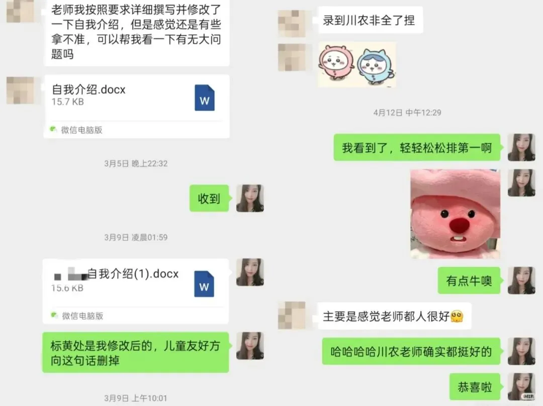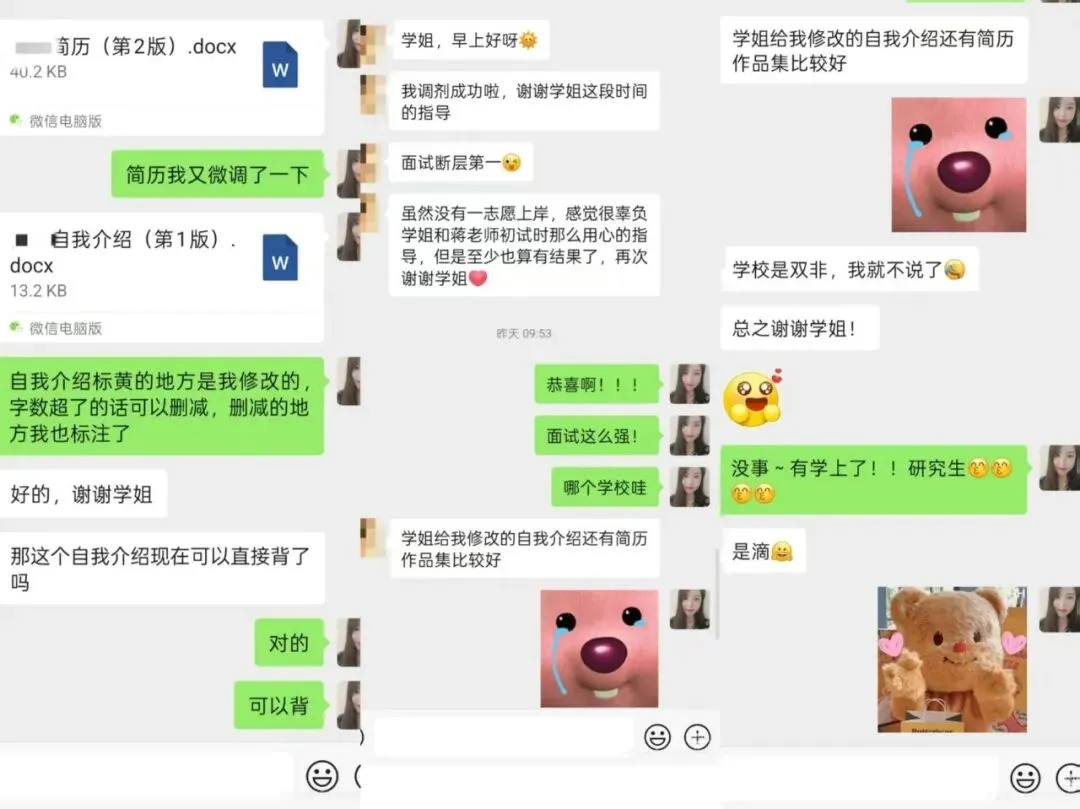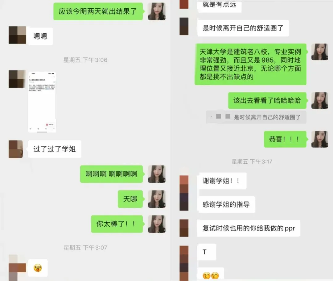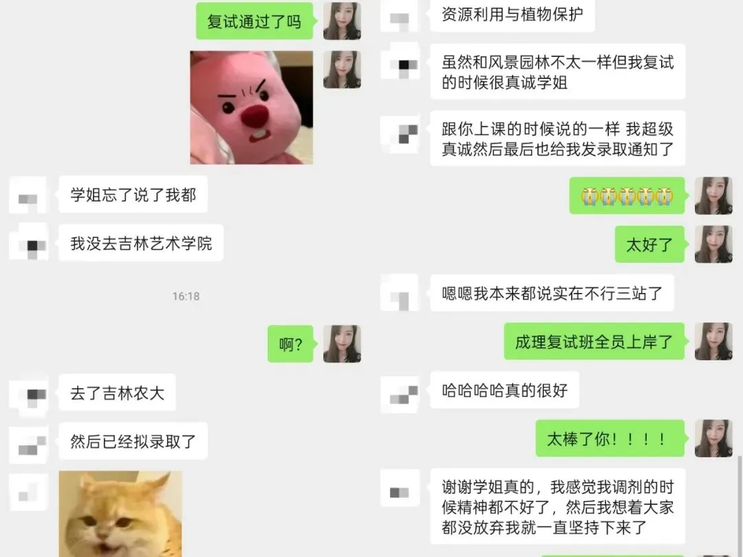 木子学姐说:这位同学一志愿报考的是浙江大学风景园林,初试分数290+,从查到分数后就明确自己要走调剂这条路了。我们单独建立了调剂服务群,调剂过程中的疑问,包括如何回复导师邮件,我们都给予了相应的解答,同时每日分享调剂信息。调剂系统开放后收到了安徽科技学院、仲恺农业工程学院、西北农林科技大学、沈阳农业大学、河南农业大学的复试通知,最终选择了仲恺。整个调剂服务从2月26日开始到4月12日拟录取结束,画上圆满句号啦!木子学姐说:调剂系统开放后,收到了浙江理工大学、南京工程学院的复试通知,因为我一直研究四川地区的高校,所以在问我浙江理工复试内容的时候我也只是靠经验做了大致的判断。但最后因为种种原因,在参加浙理的复试前接受了南京工程学院的调剂。木子学姐说:调剂系统开放后,一轮填写调剂系统就收到沈阳建筑大学、西南民族大学、北京建筑大学的复试通知,最终选择了北建大~木子学姐说:没出线之前就已经开始着手准备复试了,我也帮忙修改了简历、自我介绍,在接收复试通知前也进行了模拟面试,所以调剂成功也是顺理成章,水到渠成的事了。这位学员一志愿报考成都理工大学风景园林专业。去年10月底才找到我,距离考试仅两个月,紧急补了带背班、刷题班和冲刺班。最终初试考了300+,成功进入成理复试。复试时,她跟着我学习复试班课程,我帮她一对一修改简历、自我介绍和作品集 ,但很可惜复试被刷。不过她迅速调整状态,投入调剂流程,学习调剂课。调剂系统开放后,她收到青岛农业大学、绵阳师范学院的复试通知。之前模拟面试的时候,她口语问答磕磕巴巴,我教了她万能模板答题方法,这次调剂复试派上用场,最终成功调剂上岸。