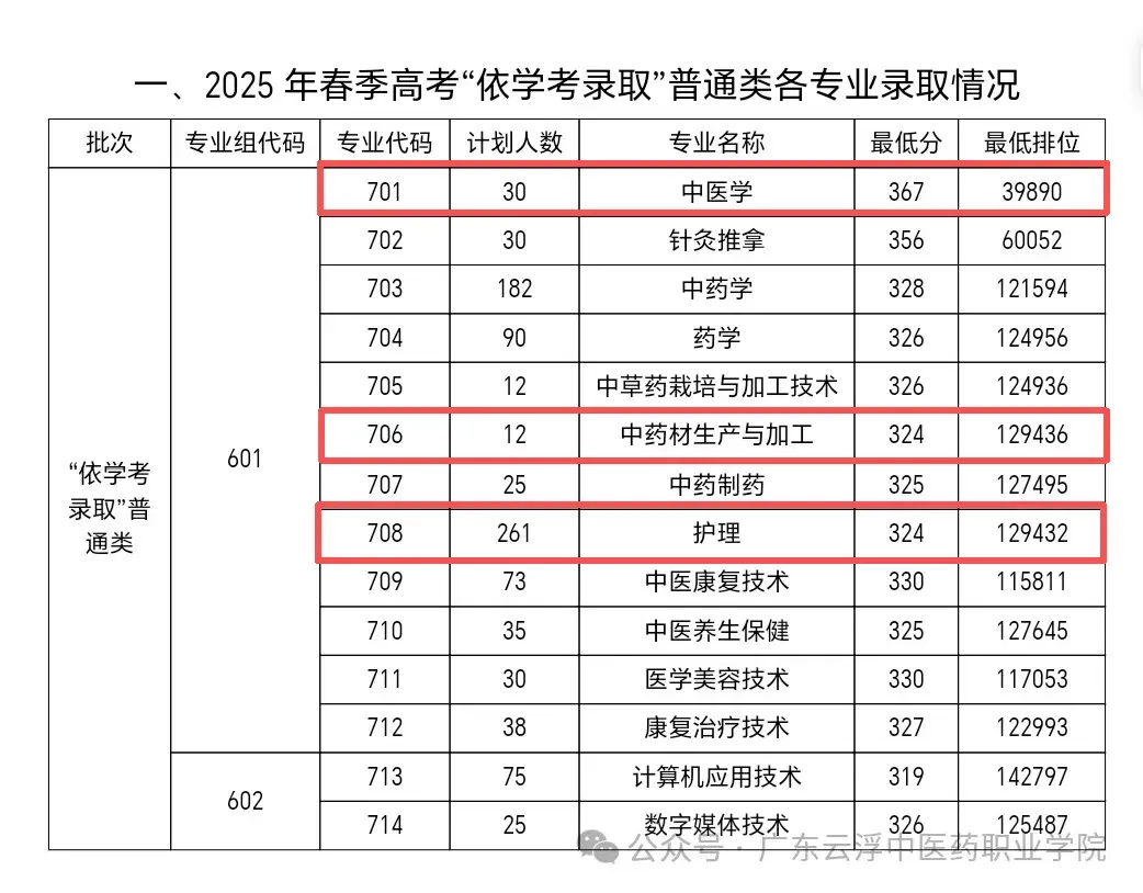 比如2025年广东云浮中医药职业学院学考601专业组的中医学专业,最低录取分数要367分。而中药材生产与加工、护理专业只要324分,相差43分,将近9万排位!
