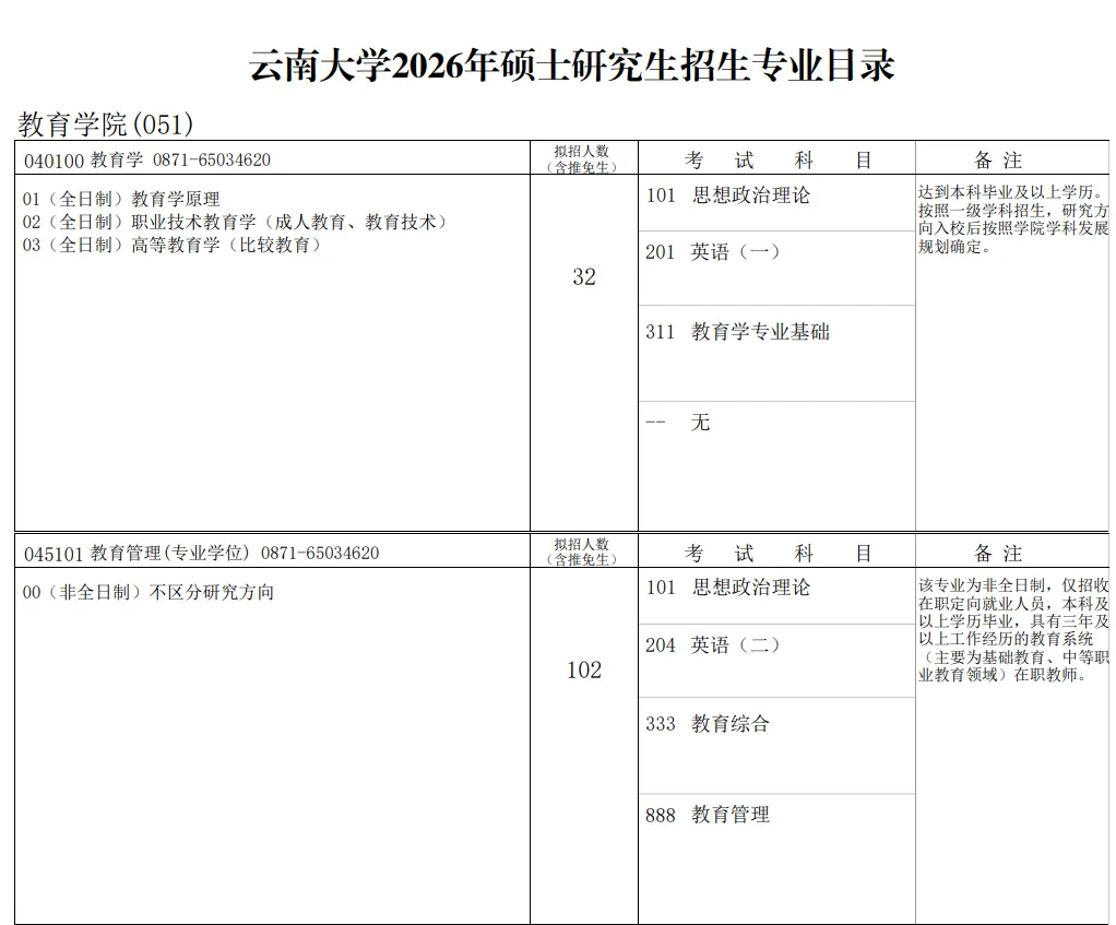 2026年我校硕士研究生招生专业按学位类别,分学术学位和专业学位两种类型。招生学科(类别),专业(领域)详见本章程公布的《云南大学2026年硕士研究生招生专业目录》(附件1)(以下简称招生专业目录)。我校除部分专业是按研究方向招生以外,其余均为按专业招生,具体以招生专业目录中各专业备注栏中的要求和说明为准。