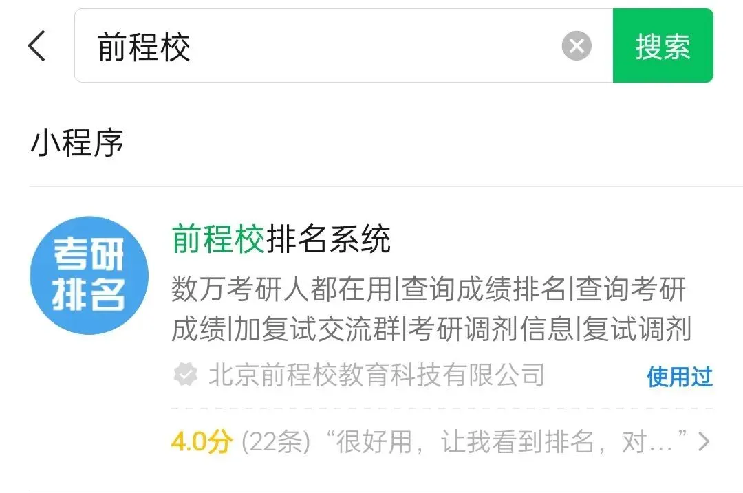 此系统已服务超过百万考生,帮助考生在考研复试中获得先机,广受好评。为了方便大家快速找到此系统,我们将此系统嵌入小程序,微信首页下拉,搜索小程序“前程校”即可点击进入!