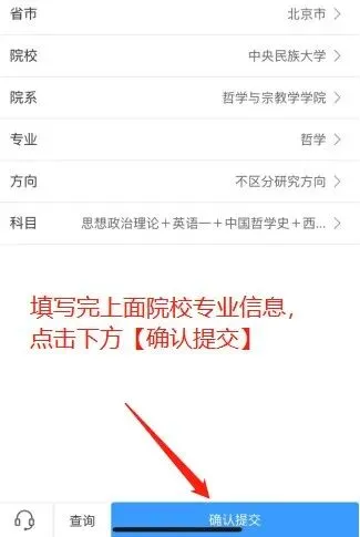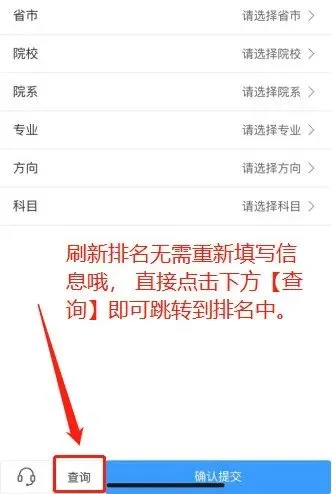 1️⃣进入排名统计系统之后,请选择:目标院校所在省份、目标院校名称、目标院系名称、报考专业、具体专业方向和科目,注意在你选择好专业方向之后,会自动生成考试科目,你只需要点击“确认提交”即可。如下图所示: