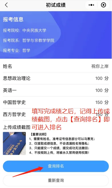 3️⃣点击查询排名即可显示相关信息。