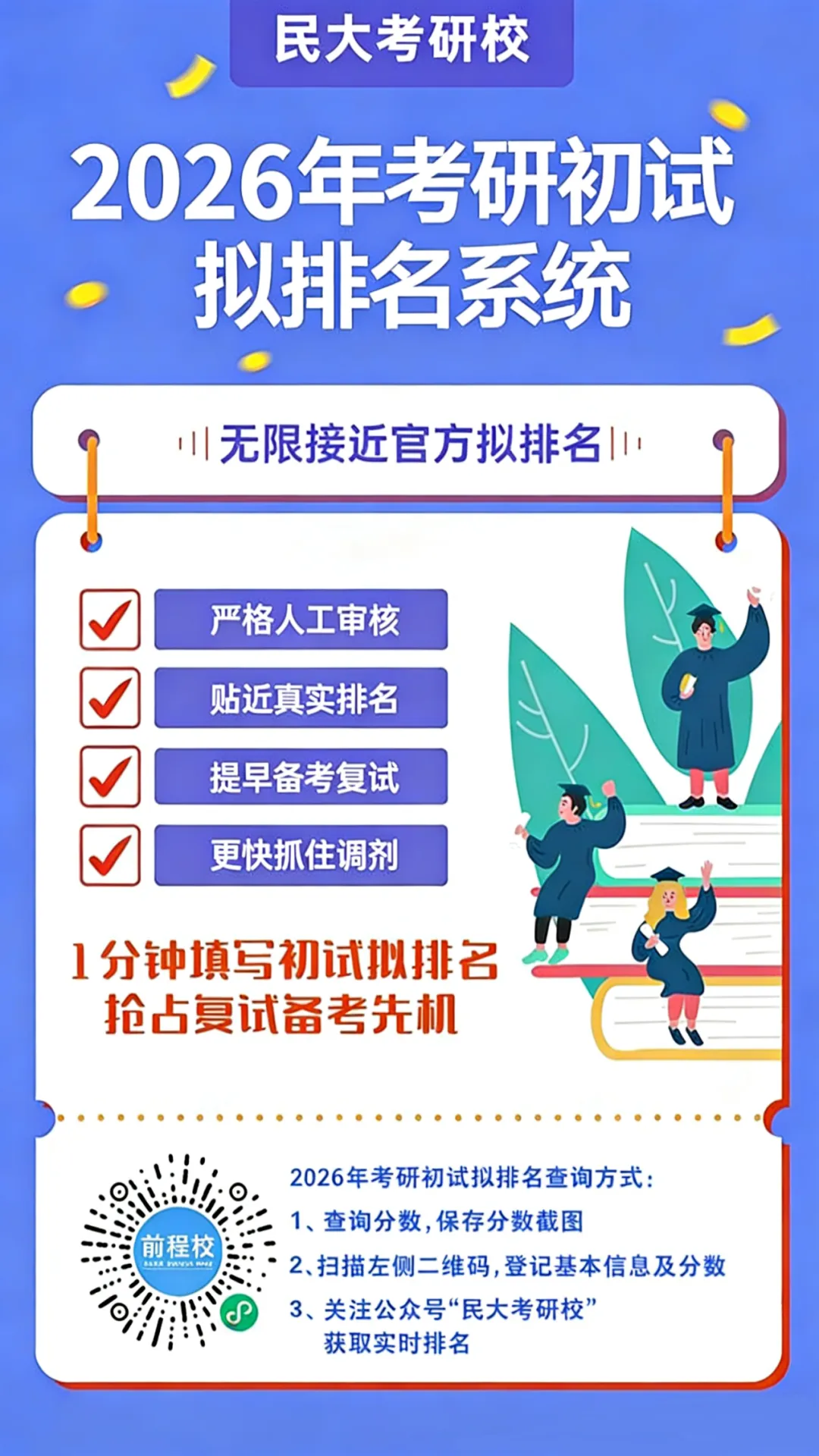 前程校初试拟排名系统重磅上线!此系统不仅操作简单,更棒的是能看到你的初试排名(PS:当然,参加的人越多,排名越准!)