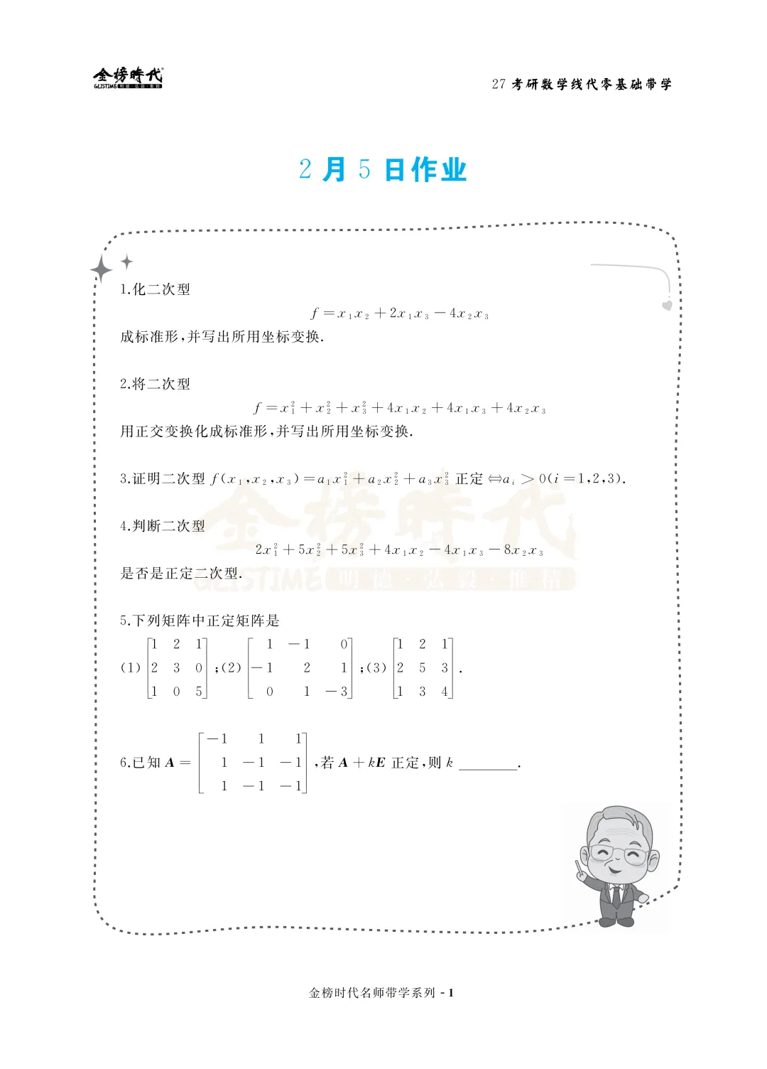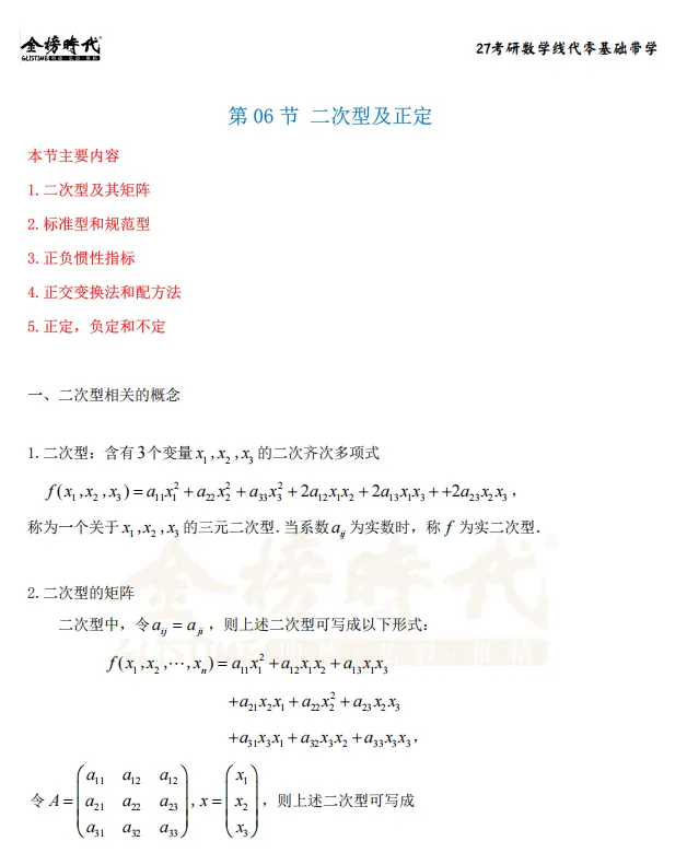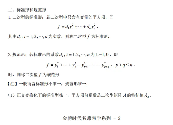 无论是正交变换法(求特征值、特征向量、正交化)还是配方法,都需要大量计算练习,务必做到熟练准确。