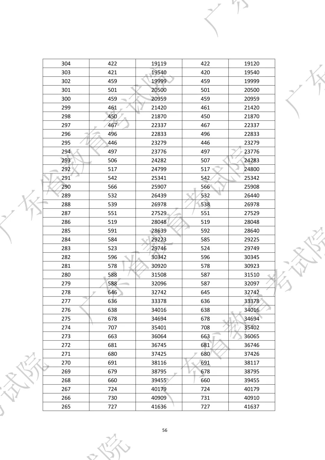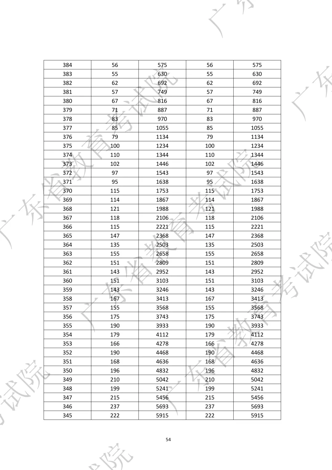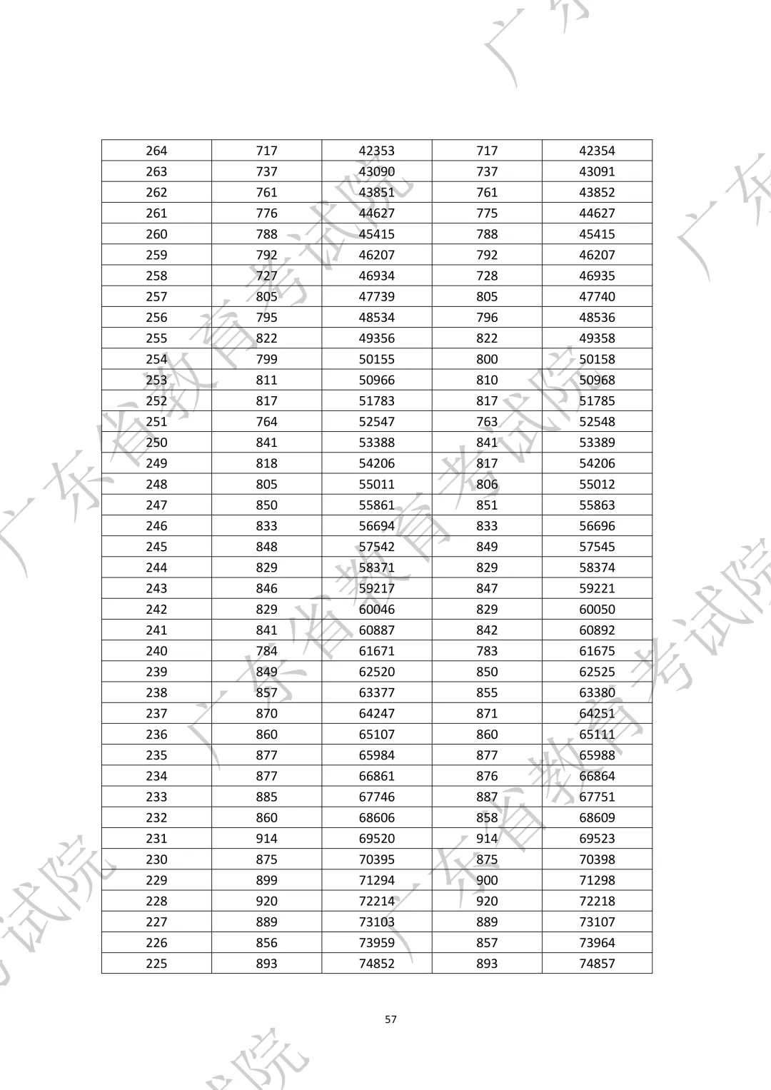 累计人数:指的是这个分数段上的分数人数累加。比如264分累计人数为42354人,表明264分及以上的人数共有42354人。