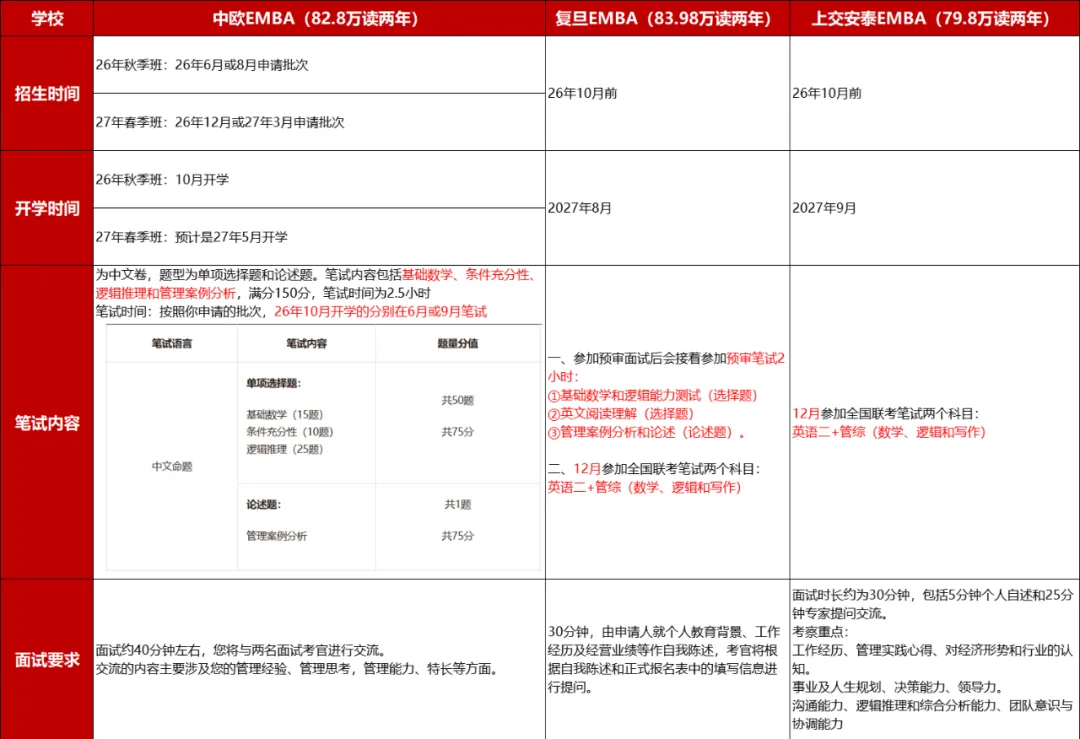 特别注意的是:中欧EMBA是一年招两个班,春季(5月上课)和秋季班(10月开课)。但复旦和交大安泰EMBA是次年8月或9月上课。所以如果你要高效,不想拖太久,那中欧EMBA是合适的;但如果你工作很忙,不着急上课,并且很在意这个研究生学历,那复旦和交大安泰EMBA是比较合适。