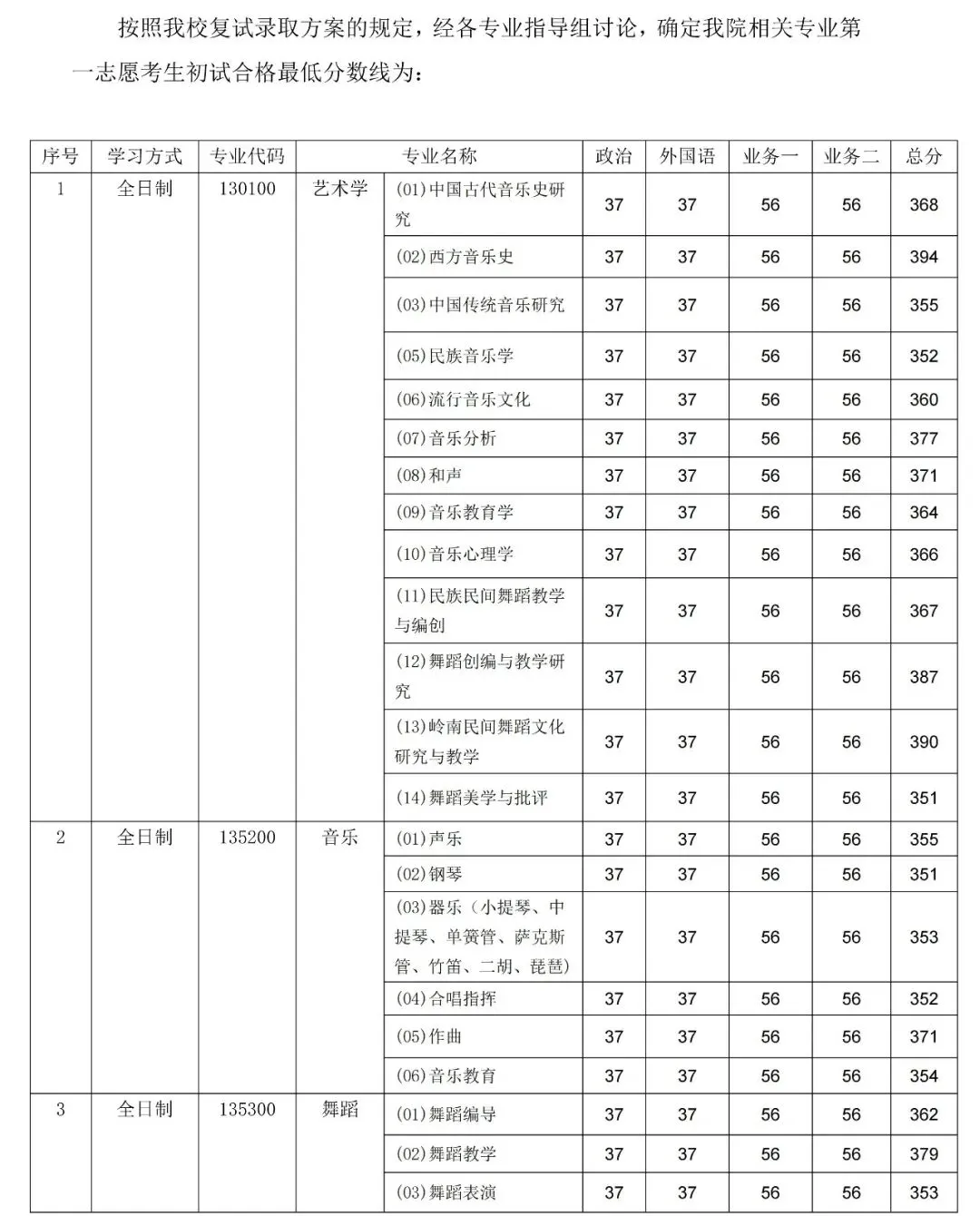 02 西方音乐史、08 和声、13 岭南民间舞蹈、14 舞蹈美学与批评,初试门槛≥370,其中 02/13 方向需 390+;