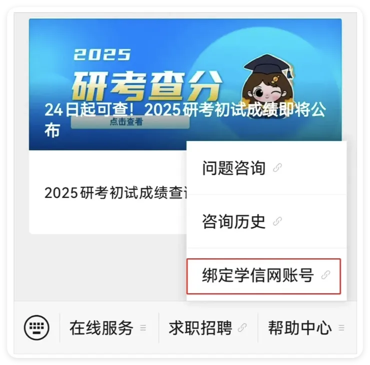 具体操作也很简单:先在微信关注 “学信网” 公众号,绑定自己的学信网账号 —— 记住一定要提前绑定,不然查分当天手忙脚乱。等成绩公布后,复制这个链接(https://yz.chsi.com.cn/apply/cjcxa/)到微信对话框,点击进去就能直接看到分数,连身份证号、准考证号都不用输。