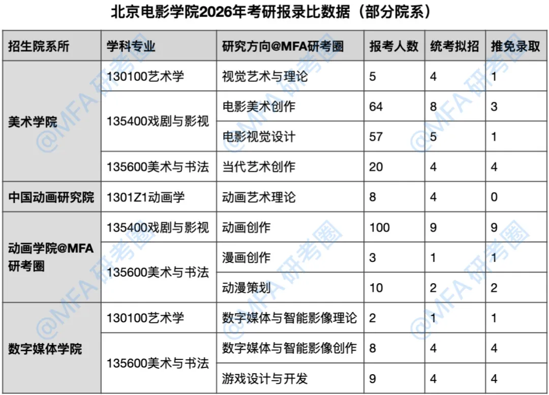 北京电影学院2026年美术学院、中国动画研究院、动画学院、数字媒体学院130100艺术学、1301Z1动画学、135400戏剧与影视、135600美术与书法等专业方向考研报录情况统计即报录比详情如下: