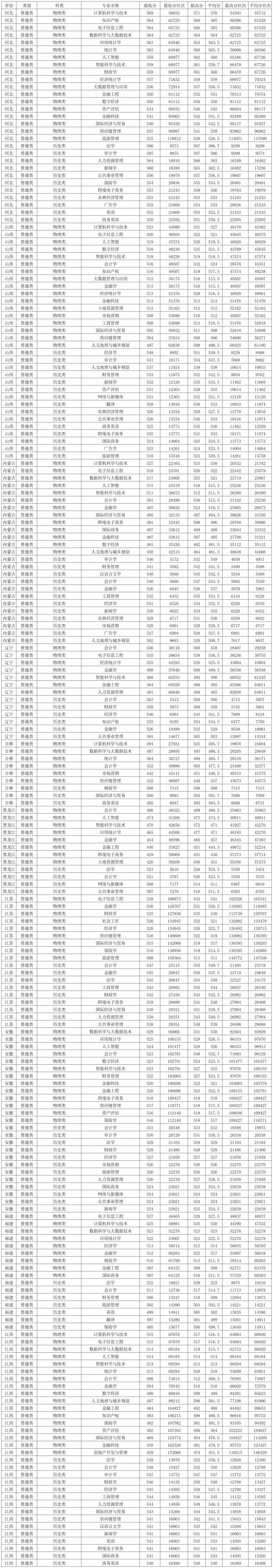 兰州财经大学2025年在河北本科批物理类录取分数线较高的专业:计算机科学与技术569分、知识产权564分、电子信息工程564分、数据科学与大数据技术564分、应用统计学563分、统计学563分,最低的是旅游管理525分,最低分位次118812。