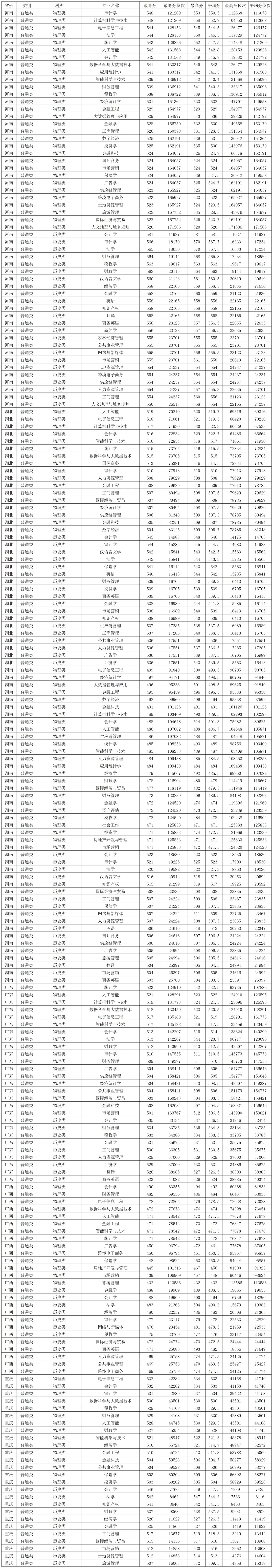 兰州财经大学2025年在河南本科批物理类录取分数线较高的专业:审计学548分、计算机科学与技术548分、电子信息工程544分、法学544分、统计学543分,最低的是人文地理与城乡规划520分,最低分位次171586。