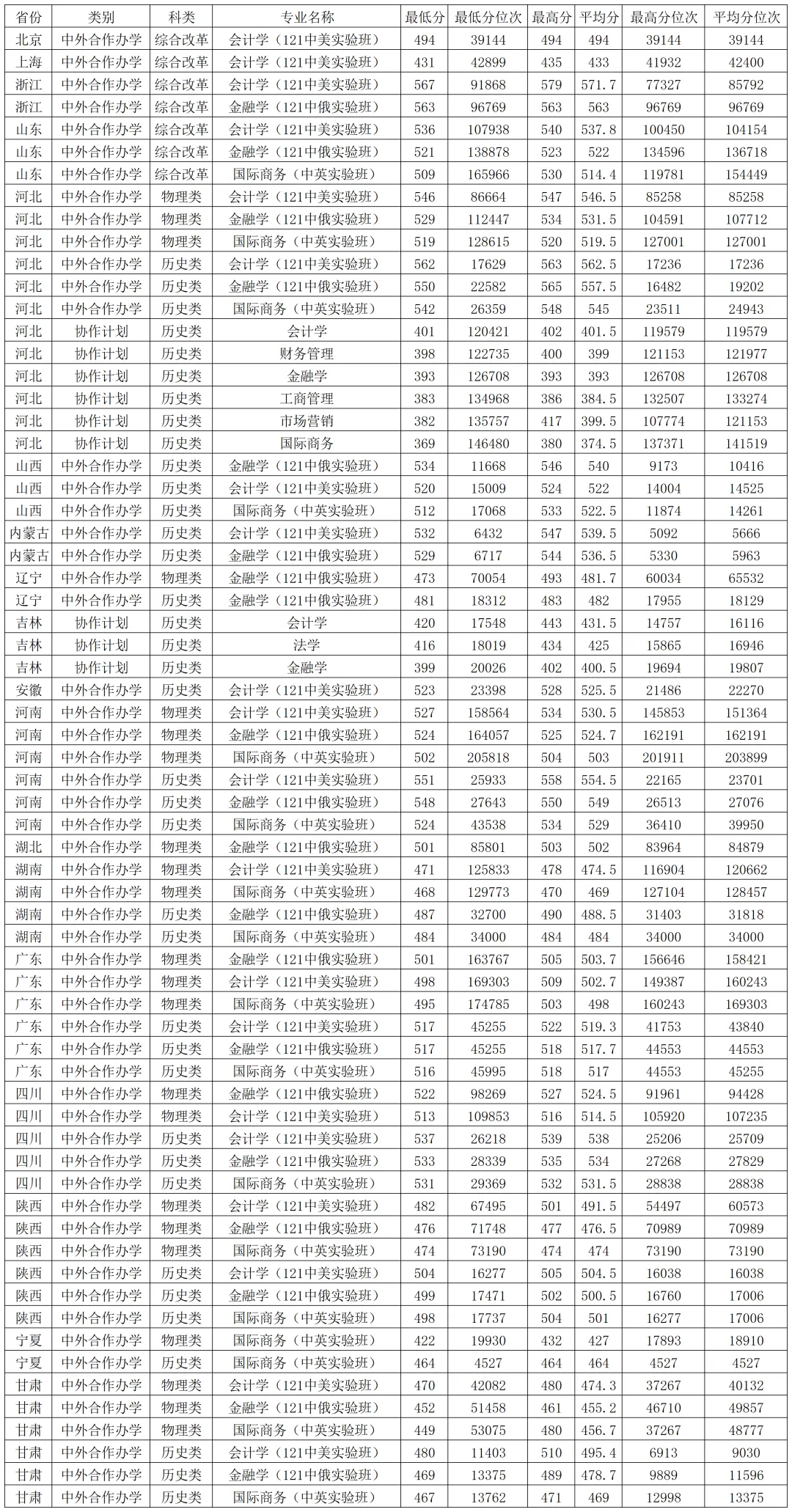 兰州财经大学2025年中外合作计划、协作计划在各省各专业录取分数线