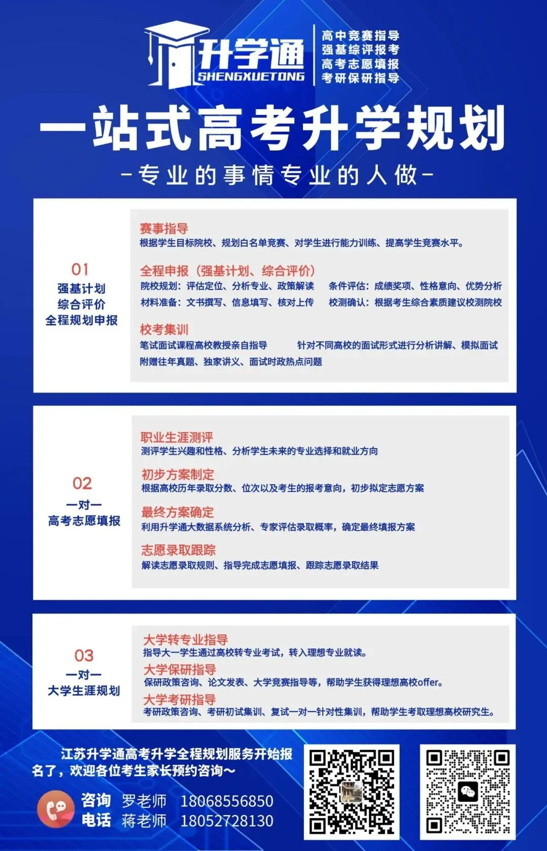 无论是高考志愿选择,还是针对各类招生计划的报名策略,我们都能根据你的兴趣和优势,量身定制最佳方案,让你在未来的教育和职业道路上更加明确方向、步伐更加坚定。专业的支持,让你的每一步都走得更稳、更远。