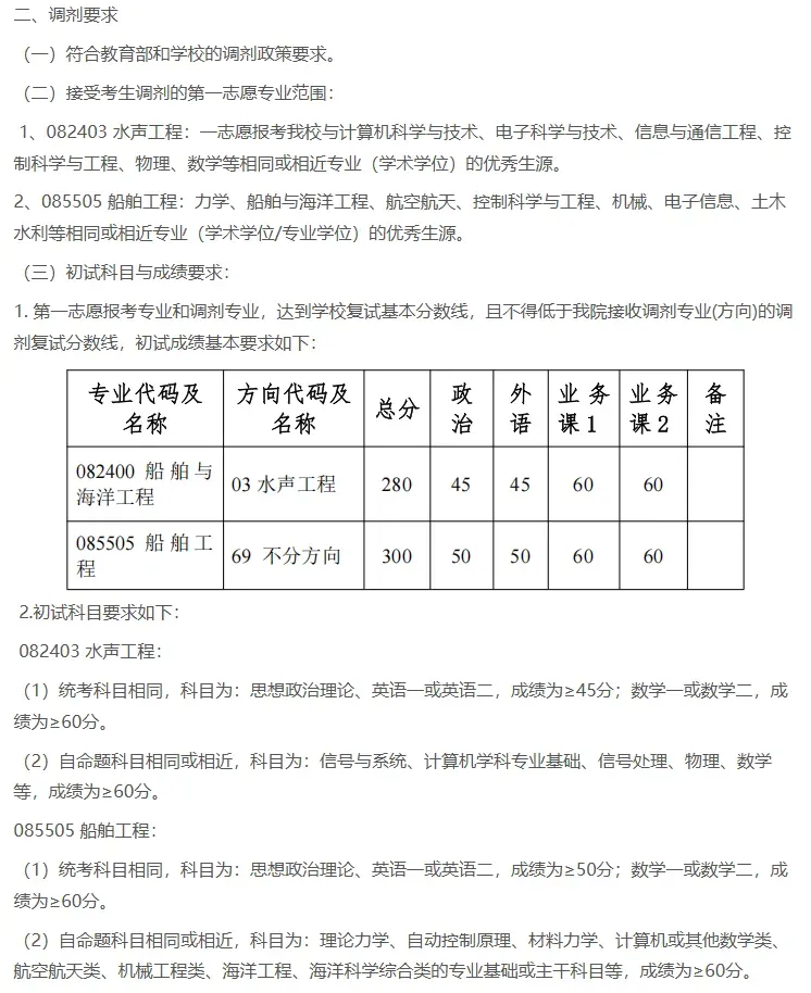 可调剂专业:船舶工程专硕招收调剂录取3人,最高分377,最低分337,平均分362.67分数分别为:377、374、337.(候补录取1人,分数为386)
