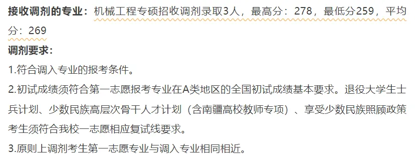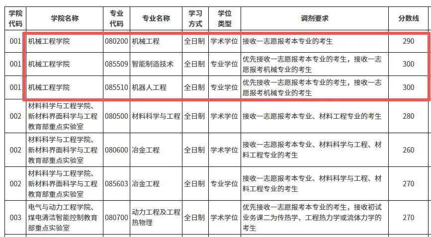 可调剂专业:机械学硕招收调剂3人,最高分:422、最低分:336、平均分:374.67