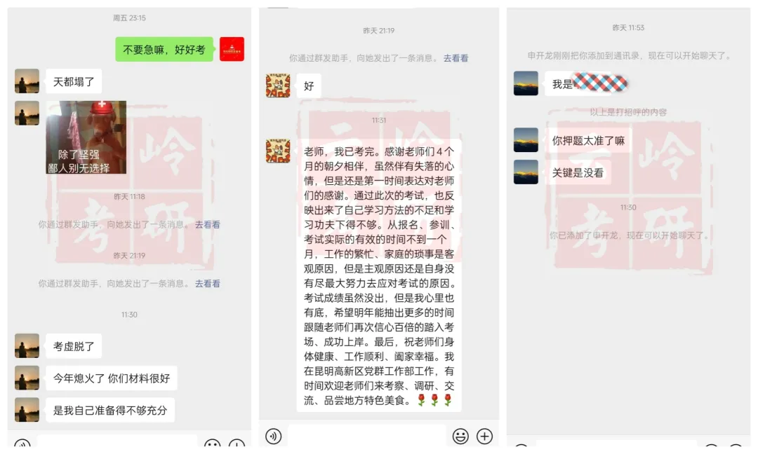 2026年云南省委党校研究生招生已报名!各位同学,抓紧备战,招生政策每年都在变动,早拿证,早安心。云岭考研团队深耕云南本土10年,是唯一拥有云南全年份、全专业、全系列真题原题的团队。2025年,我们带领众多同学成功上岸,以下为各位考生的真实反馈: