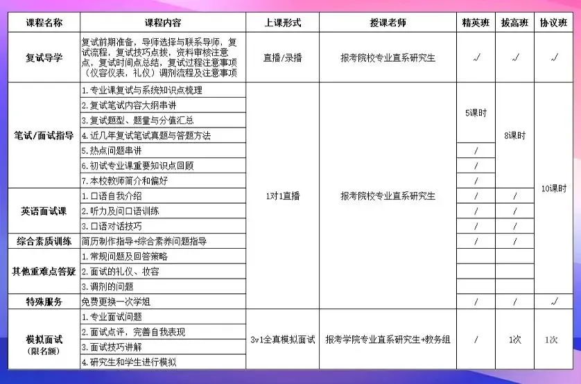 考研复试班,根据不同情况,我们制定了3种不同的班型,精英班、拔高班和协议班,直系学长学姐一对一授课,根据不同专业提供包含听力、口语、笔试、面试、历年复试习题精讲等的教学指导,助你考研上岸一臂之力!