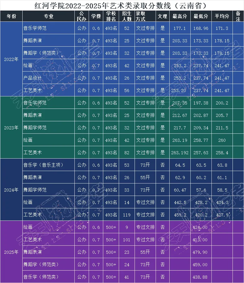 红河学院2022-2025年艺术类录取分数线