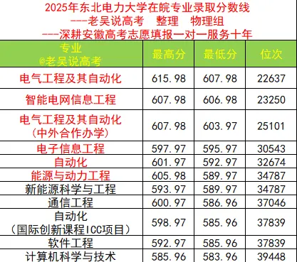 下面我们看看在安徽要多少分才能录取东北电力大学电工类专业,电气工程及其自动化需要607分,智能电网信息工程需要606分,电气工程中外合作需要603分。