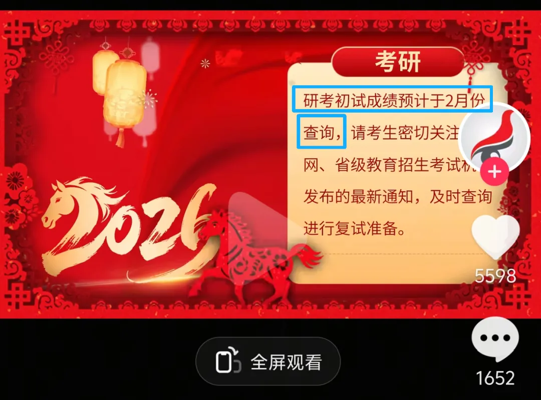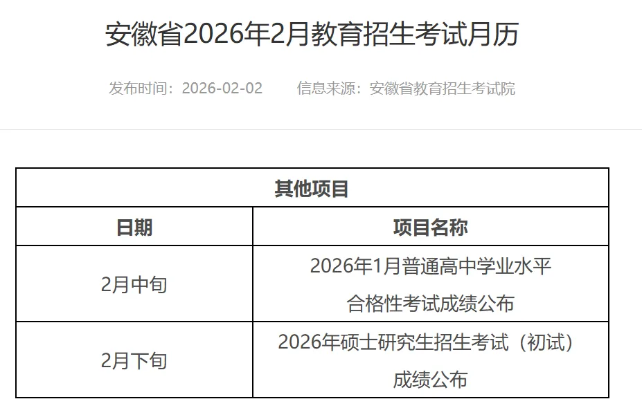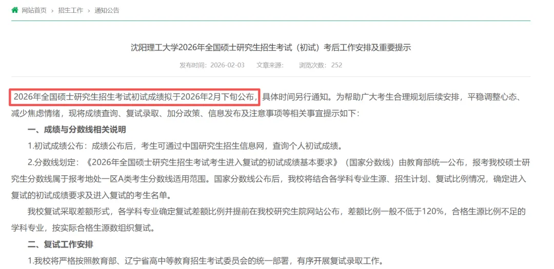 紧接着,沈阳理工大学等多所高校/考试院发布通知,明确写道:“2026年全国硕士研究生招生考试初试成绩,拟于2026年2月下旬公布。”