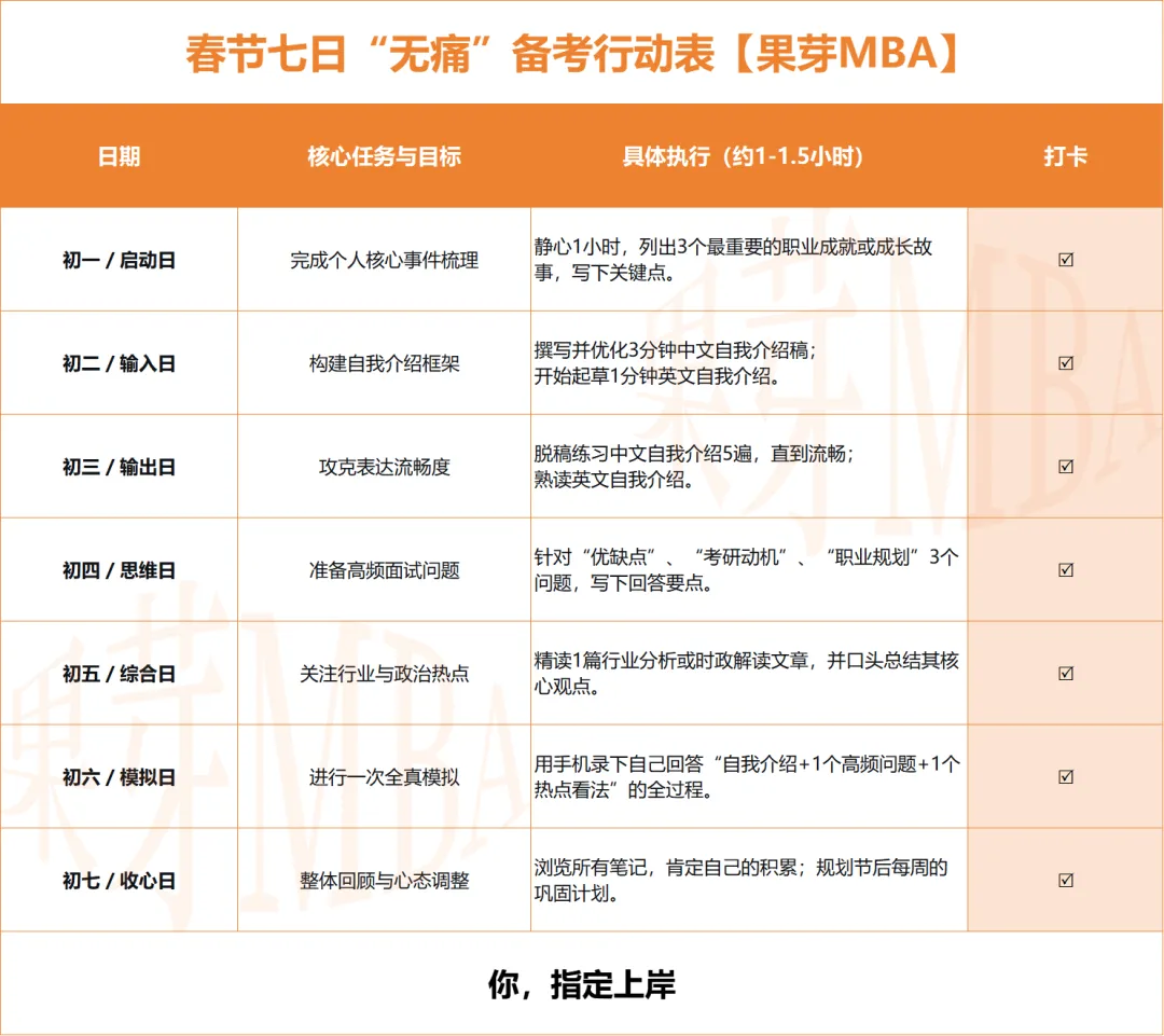 假期的目标是 “完成梳理”和“建立信心” ,而不是耗尽精力。通过这七天的有序准备,在节后以一种准备充分、心中有底的状态,从容应对复试挑战。