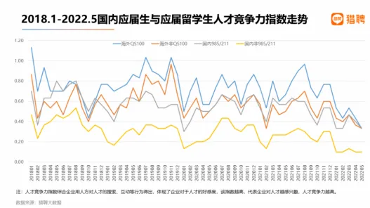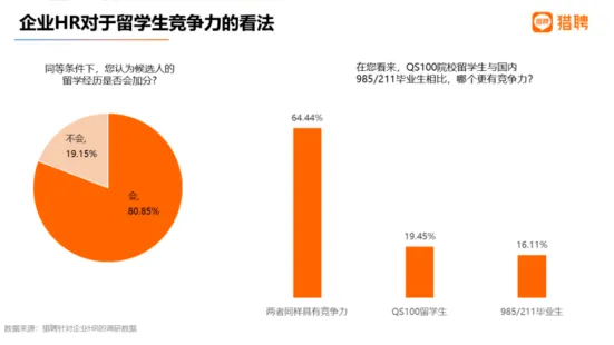 留学生在就业市场也有独特优势。根据猎聘发布的报告,海外 QS100 院校毕业生在国内就业竞争力明显高于国内非 985/211 院校毕业生,甚至与国内 985/211 院校毕业生相当。