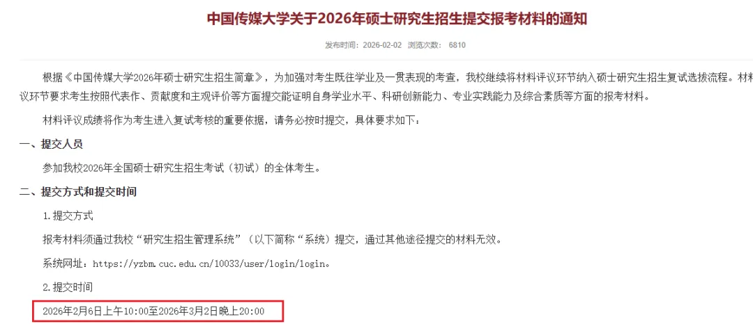 中国传媒大学发布26考研报考材料提交通知,要求报考该校的考生提交评议材料,将作为考生进入复试考核的重要依据!所以请报考中传的考生务必仔细阅读通知,并按时提交材料。