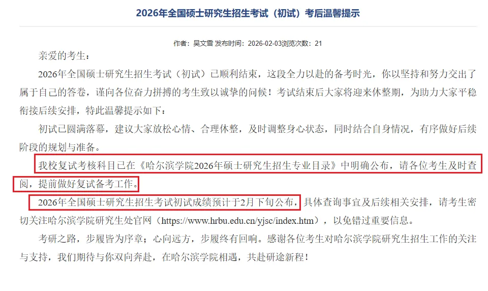 2月3日,哈尔滨学院发布最新公告,2026年全国硕士研究生招生考试(初试)考后温馨提示,2026年全国硕士研究生招生考试初试成绩预计于2月下旬公布,具体查询事宜及后续相关安排,请考生密切关注哈尔滨学院研究生处官网,以免错过重要信息。