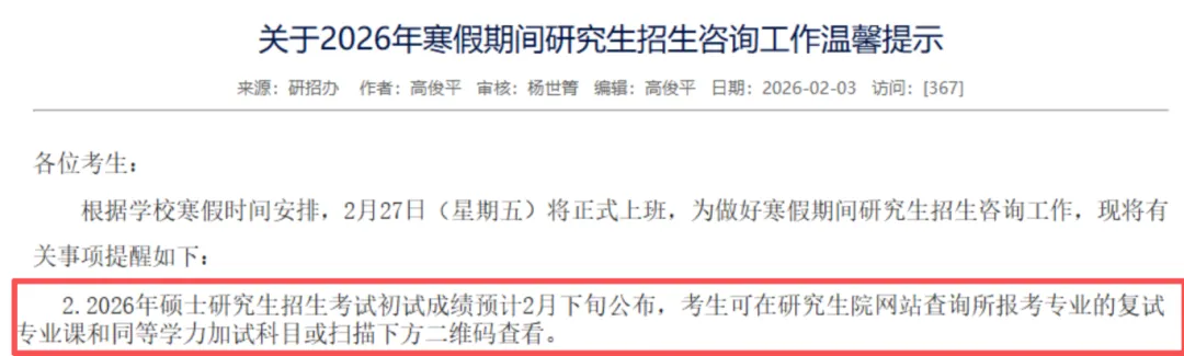 西南石油大学2月3日最新发布“关于2026年寒假期间研究生招生咨询工作温馨提示”,其中提到了2026年硕士研究生招生考试初试成绩预计2月下旬公布,考生可在研究生院网站查询所报考专业的复试专业课和同等学力加试科目。