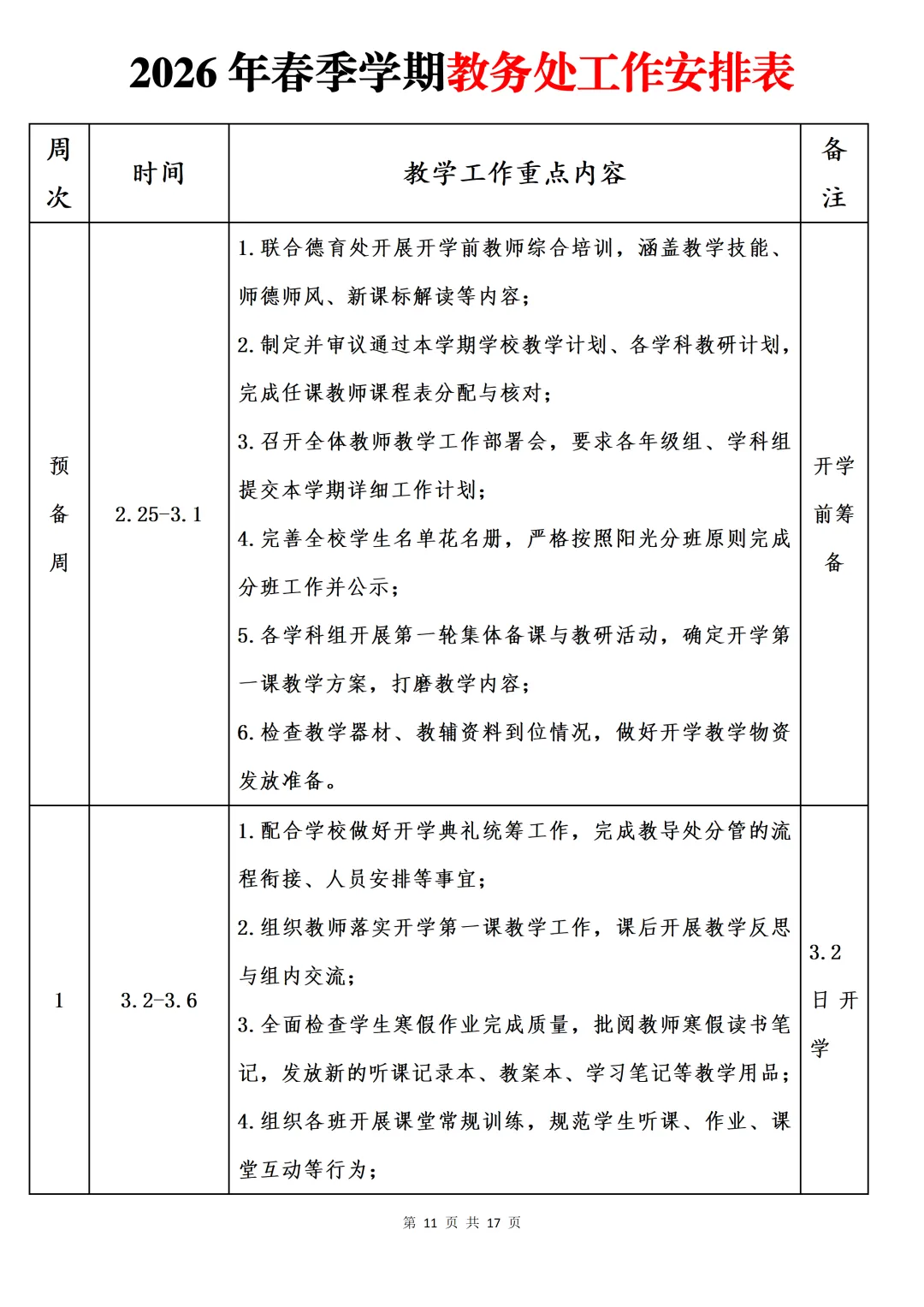 教育之道,无他,唯用心与深耕而已。教学工作是学校发展的核心命脉,教务处作为教学工作的统筹与实施部门,肩负着优化教学管理、提升教学质量、促进教师专业成长、助力学生全面发展的重要使命。2026年春季学期,我校教务处将以新课标为指引,立足学校教学实际,紧扣“提质增效、深耕课堂”的核心目标,扎实推进教学常规管理,创新教研活动形式,精准落实学情指导,统筹做好各项教学工作,推动学校教学工作高质量发展。本计划结合学校教学工作现状制定,明确工作方向、目标与举措,为新学期教学工作有序开展提供指引。