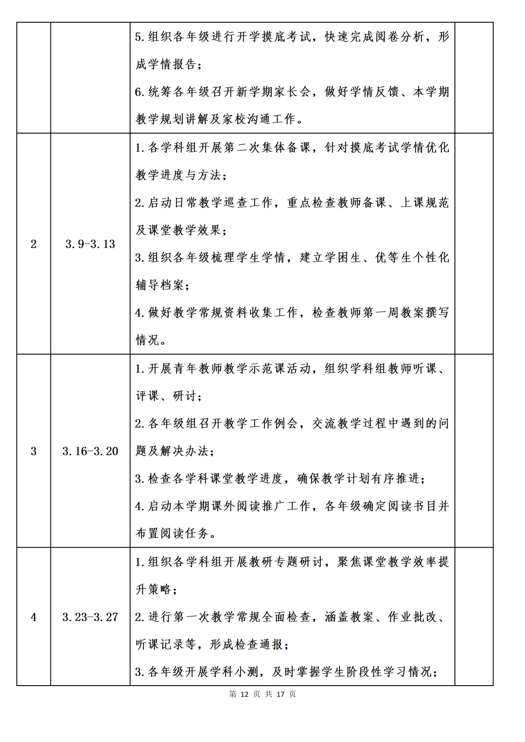 教学常规是教学工作的核心环节,本学期将以精细化管理为抓手,推动教学常规落地落实。一是抓实课堂教学规范,启动日常教学巡查工作,重点检查教师备课、上课流程规范,关注课堂教学效果,及时纠正教学中的问题,引导教师打造高效课堂;二是完善备课与作业管理,定期开展教学常规检查·····