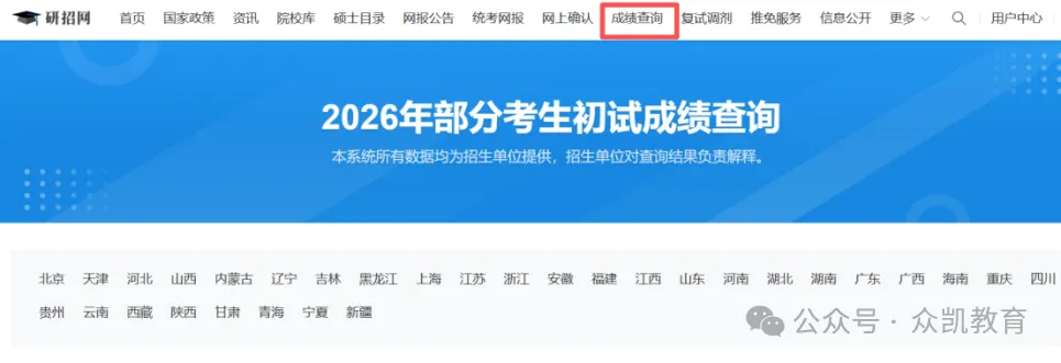 刺激版(学信网已经绑定微信或还在浏览器登录状态的,进入即可直面成绩)https://yz.chsi.com.cn/apply/cjcxa/省教育部招生相关网站也可以查询研究生初试成绩!网站名一般为 XX 省考试院或招生信息网,不同地区叫法不同。只需要输入大家的准考证号和身份证号就可以查询到!省市 | 查询网址(教育考试院) |