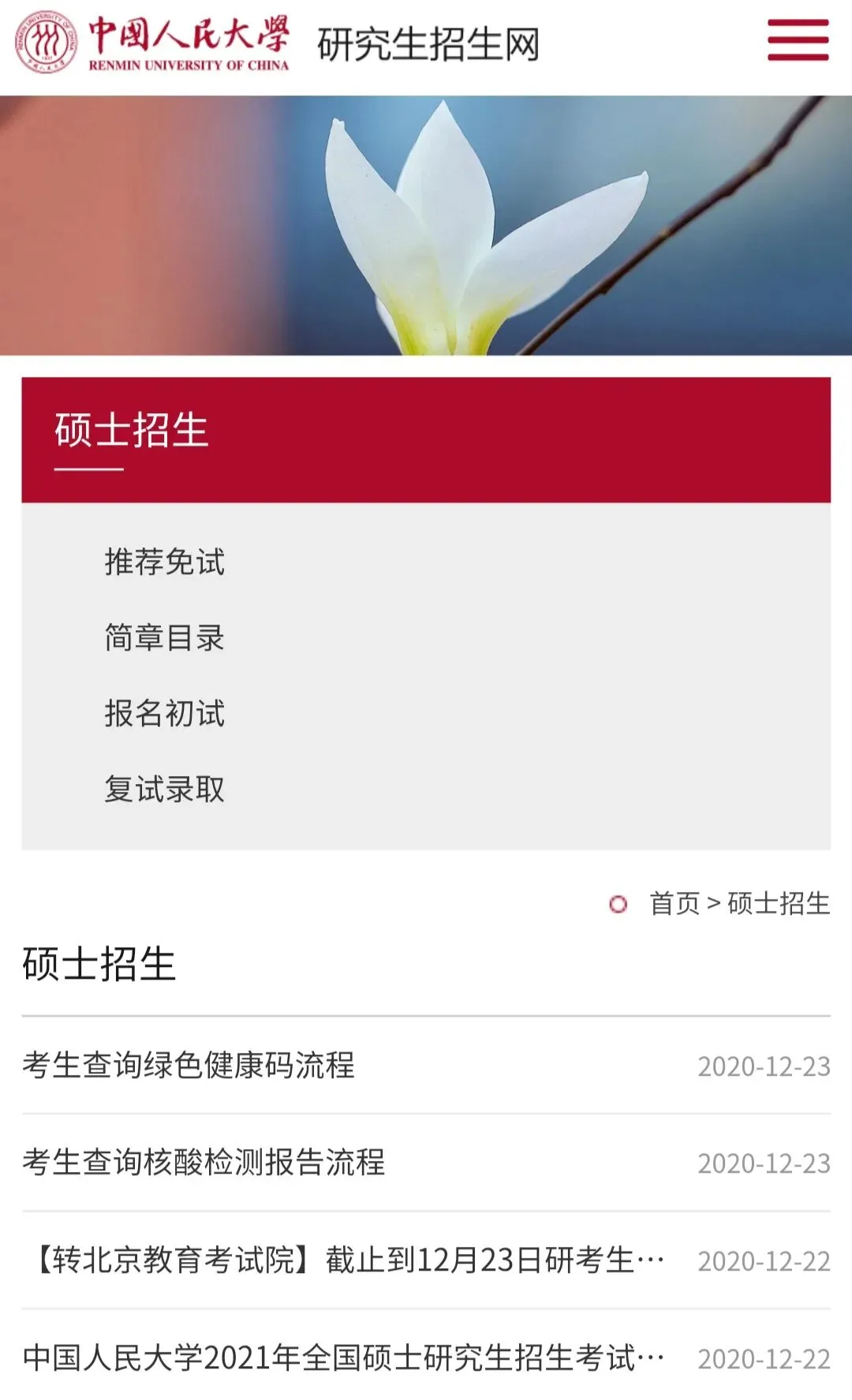 中国人民大学关于招收研究生的所有通知都会放在这个网站上,像招生简章、报名、录取情况、调剂信息等都会在这个网站上通知。