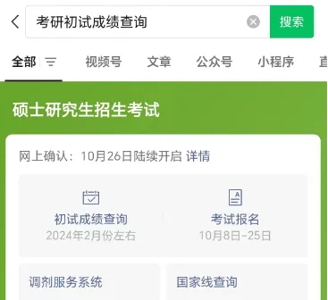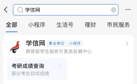 方法②:首页搜索栏输入“学信网”,进入“学信网”官方小程序。下拉页面选择“研招网”,点击进入。在导航栏选择“成绩查询”,点击进入,根据页面提示,进行初试成绩查询。
