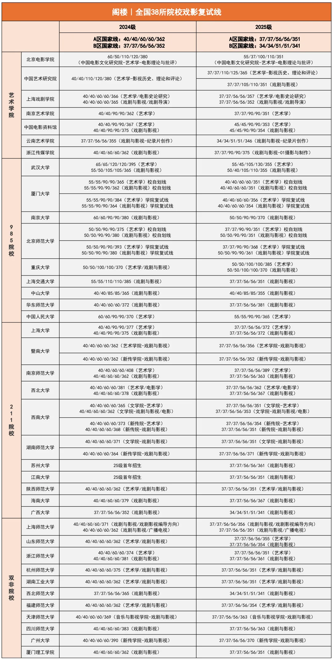 近两年全国38所院校戏影复试线