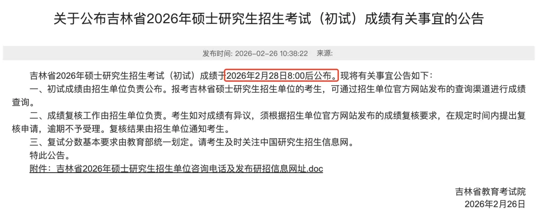 吉林省2026年硕士研究生招生考试(初试)成绩于2026年2月28日8:00后公布。