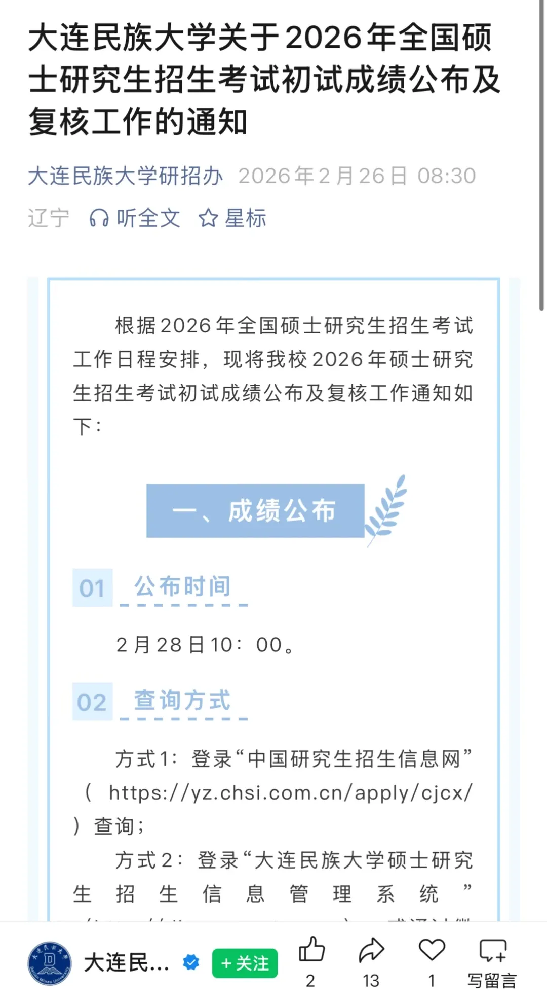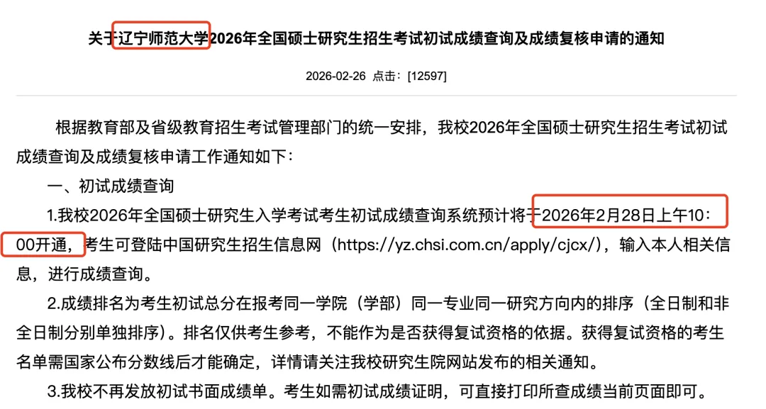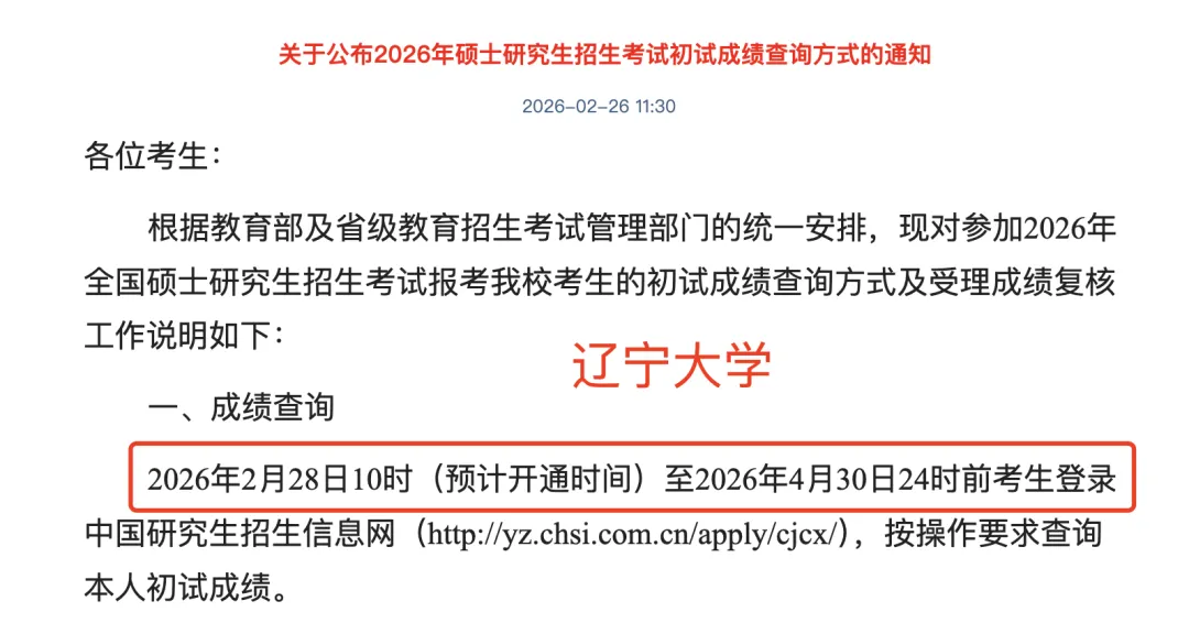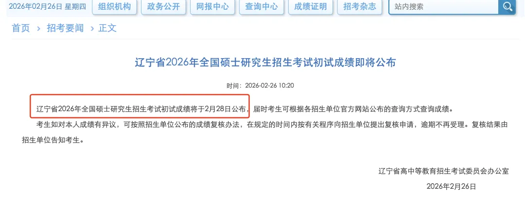 辽宁省2026年全国硕士研究生招生考试初试成绩将于2月28日公布,届时考生可根据各招生单位官方网站公布的查询方式查询成绩。
