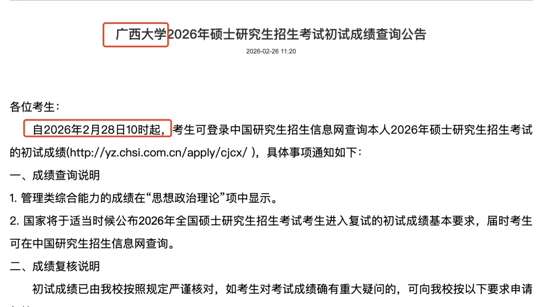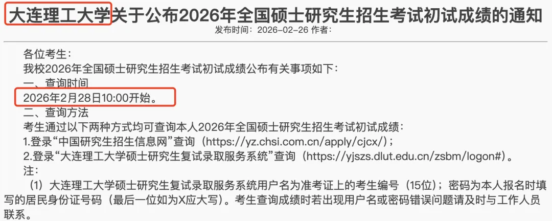 2026年全国硕士研究生招生考试初试成绩将于2月28日公布。