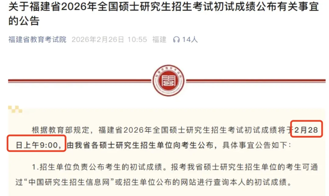 根据教育部规定,福建省2026年全国硕士研究生招生考试初试成绩将于2月28日上午9:00,由福建省各硕士研究生招生单位向考生公布。