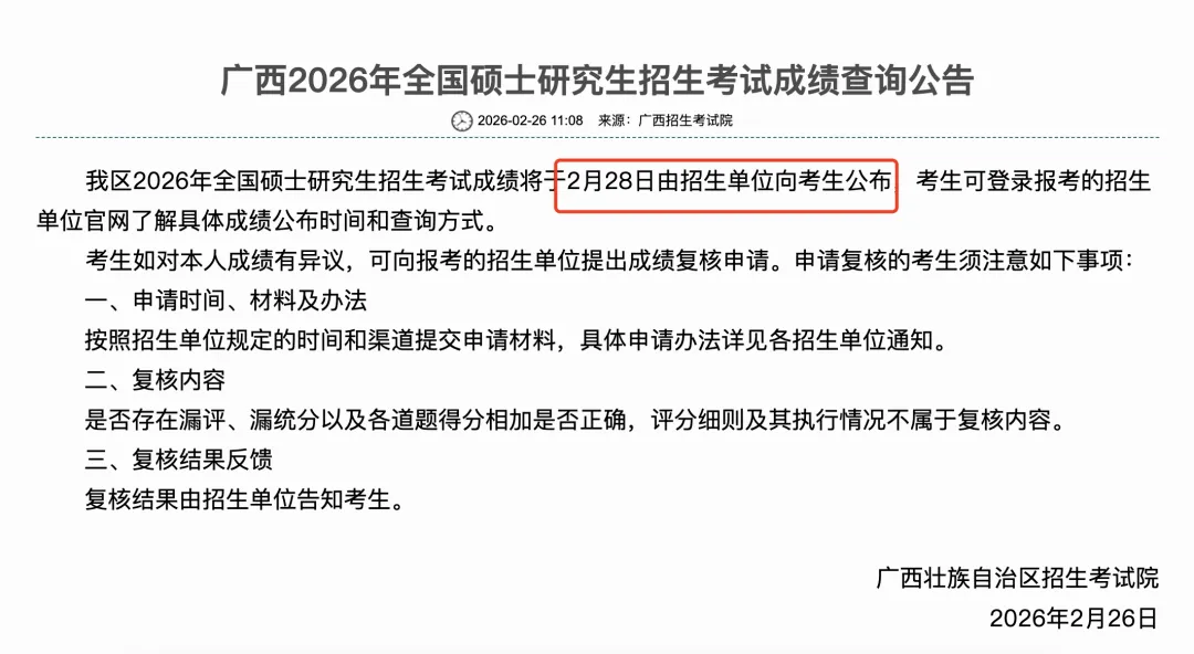 我区2026年全国硕士研究生招生考试成绩将于2月28日由招生单位向考生公布,考生可登录报考的招生单位官网了解具体成绩公布时间和查询方式。