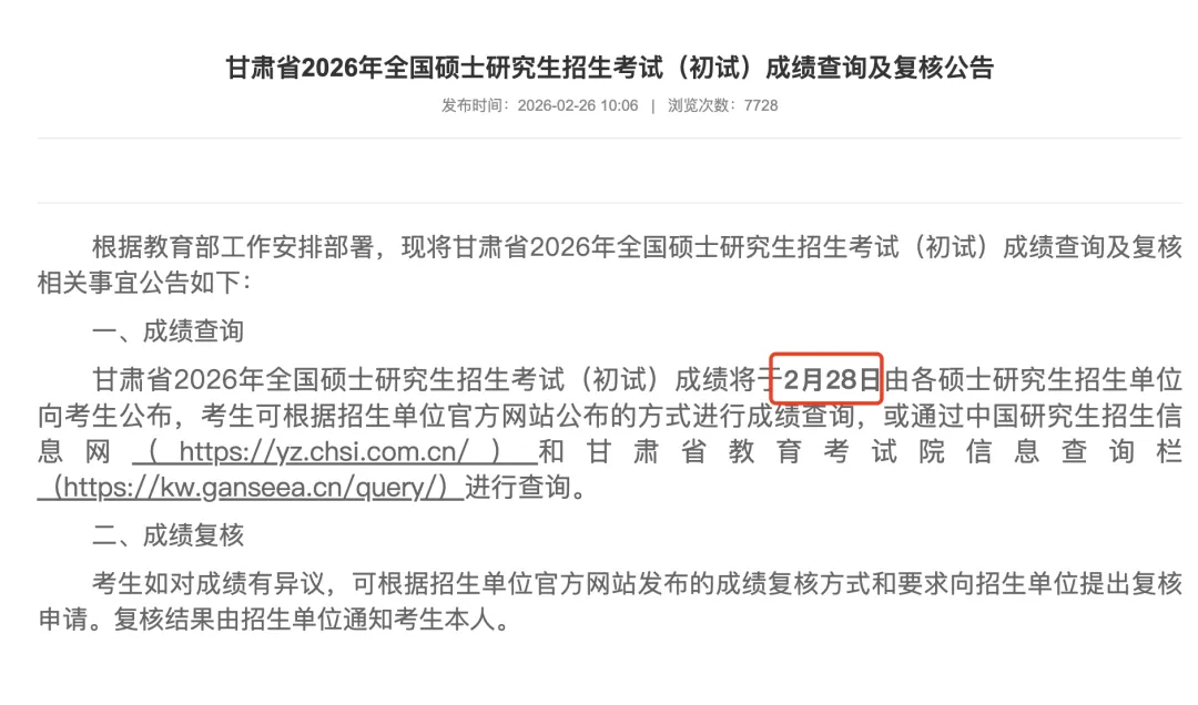 甘肃省2026年全国硕士研究生招生考试(初试)成绩将于2月28日由各硕士研究生招生单位向考生公布,考生可根据招生单位官方网站公布的方式进行成绩查询,或通过中国研究生招生信息网和甘肃省教育考试院信息查询栏进行查询。