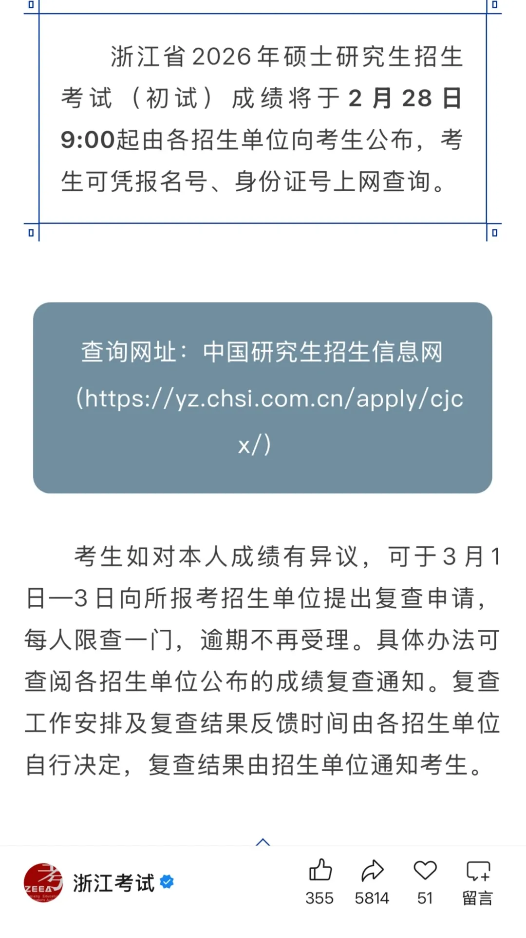 浙江省2026年硕士研究生招生考试(初试)成绩将于2月28日9:00起由各招生单位向考生公布。