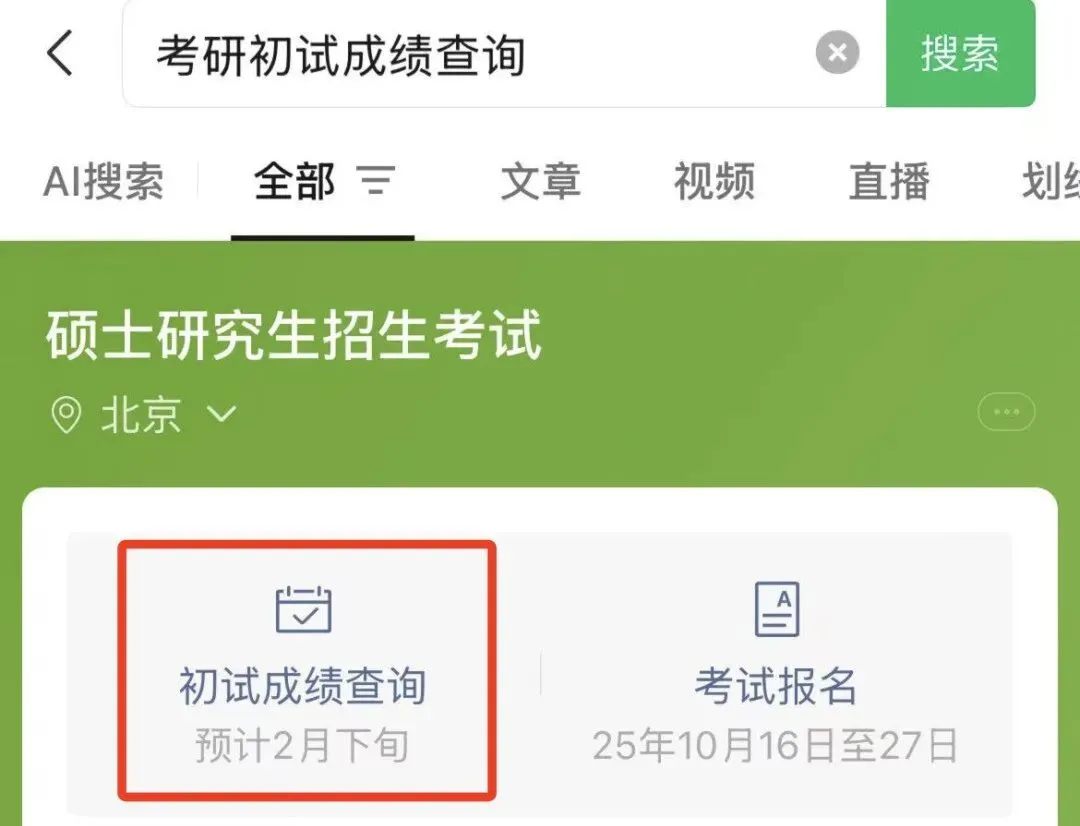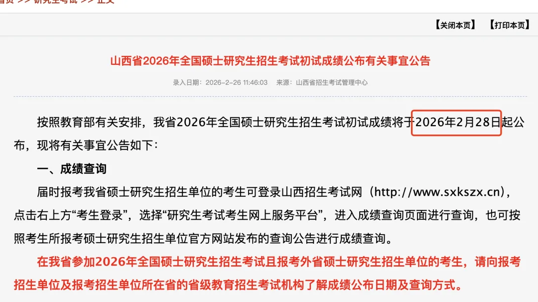 2026年全国硕士研究生招生考试初试成绩将于2月28日 9:00开通查询。