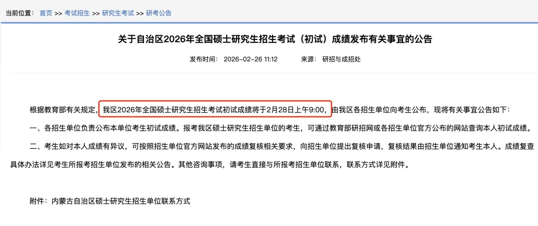 根据教育部有关规定,我区2026年全国硕士研究生招生考试初试成绩将于2月28日上午9:00,由我区各招生单位向考生公布。
