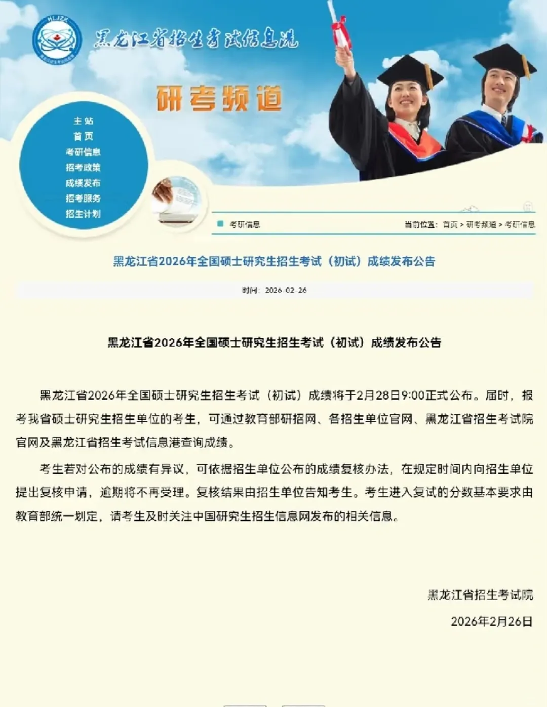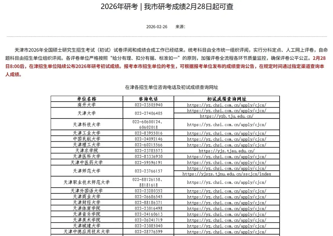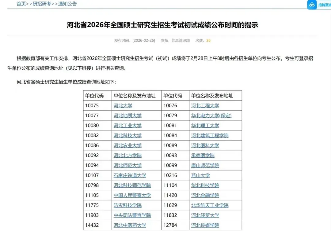 按照教育部有关安排,我省2026年全国硕士研究生招生考试初试成绩将于2026年2月28日起公布。