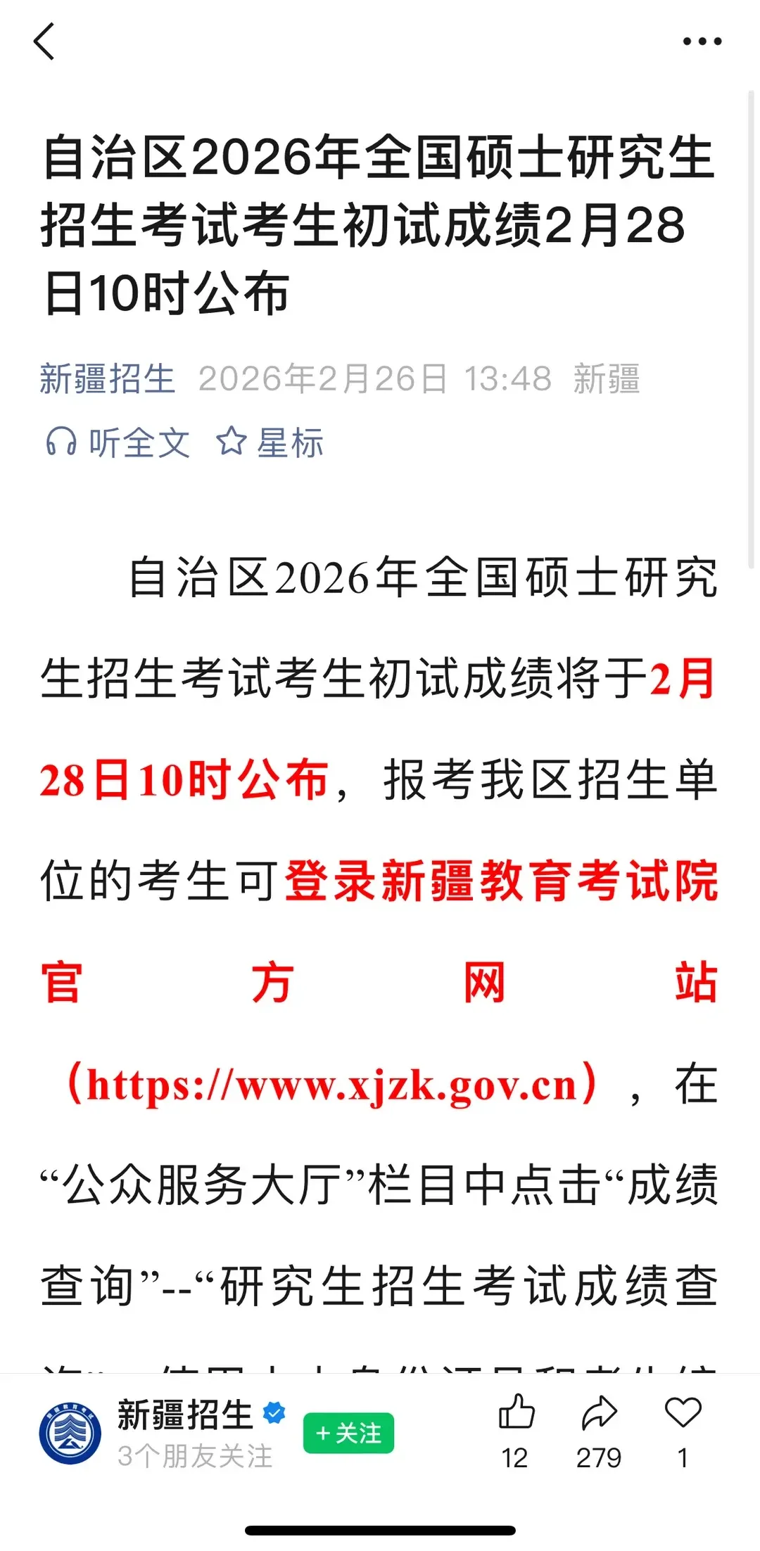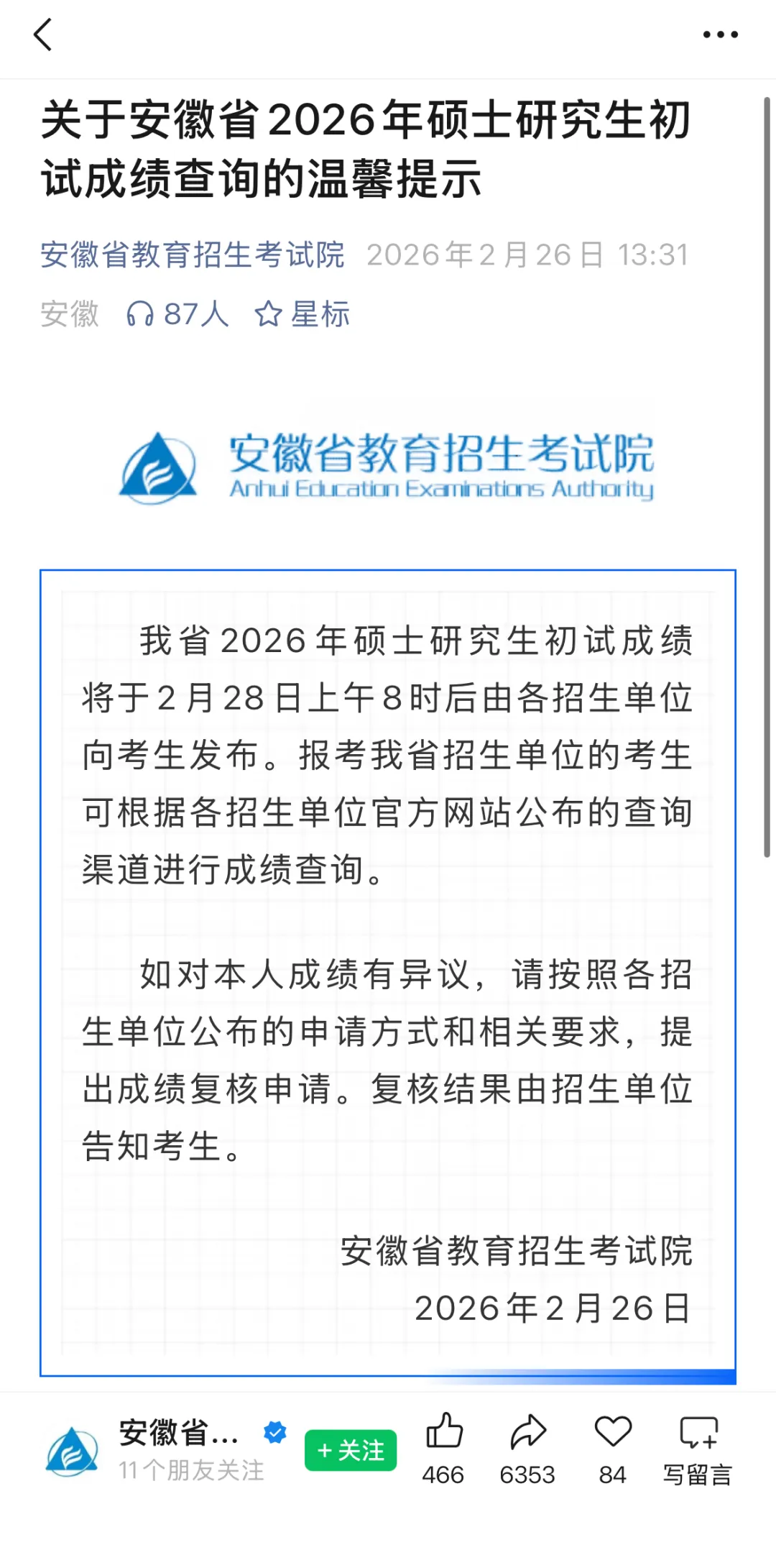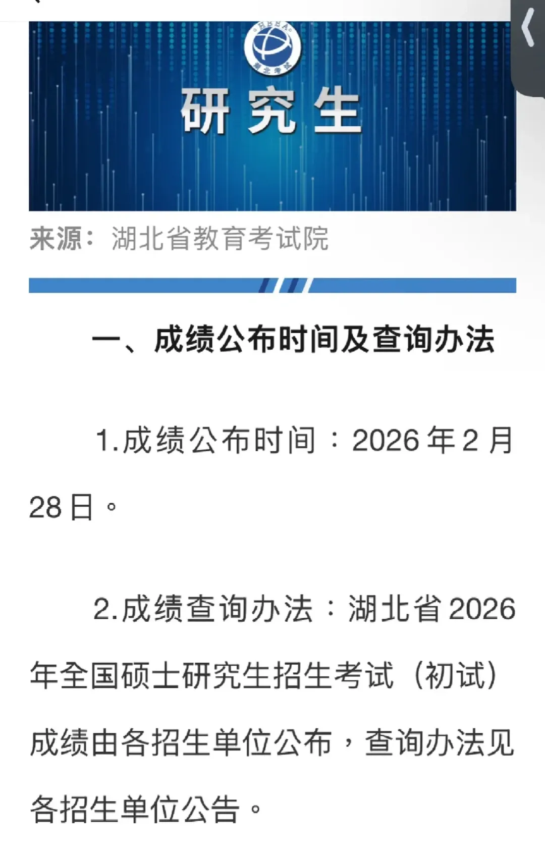 按照教育部有关安排,我省2026年全国硕士研究生招生考试初试成绩将于2026年2月28日起公布。