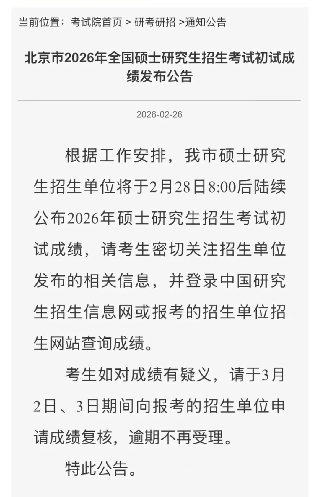 2026年全国硕士研究生招生考试初试成绩将于2月28日 10:00公布。
